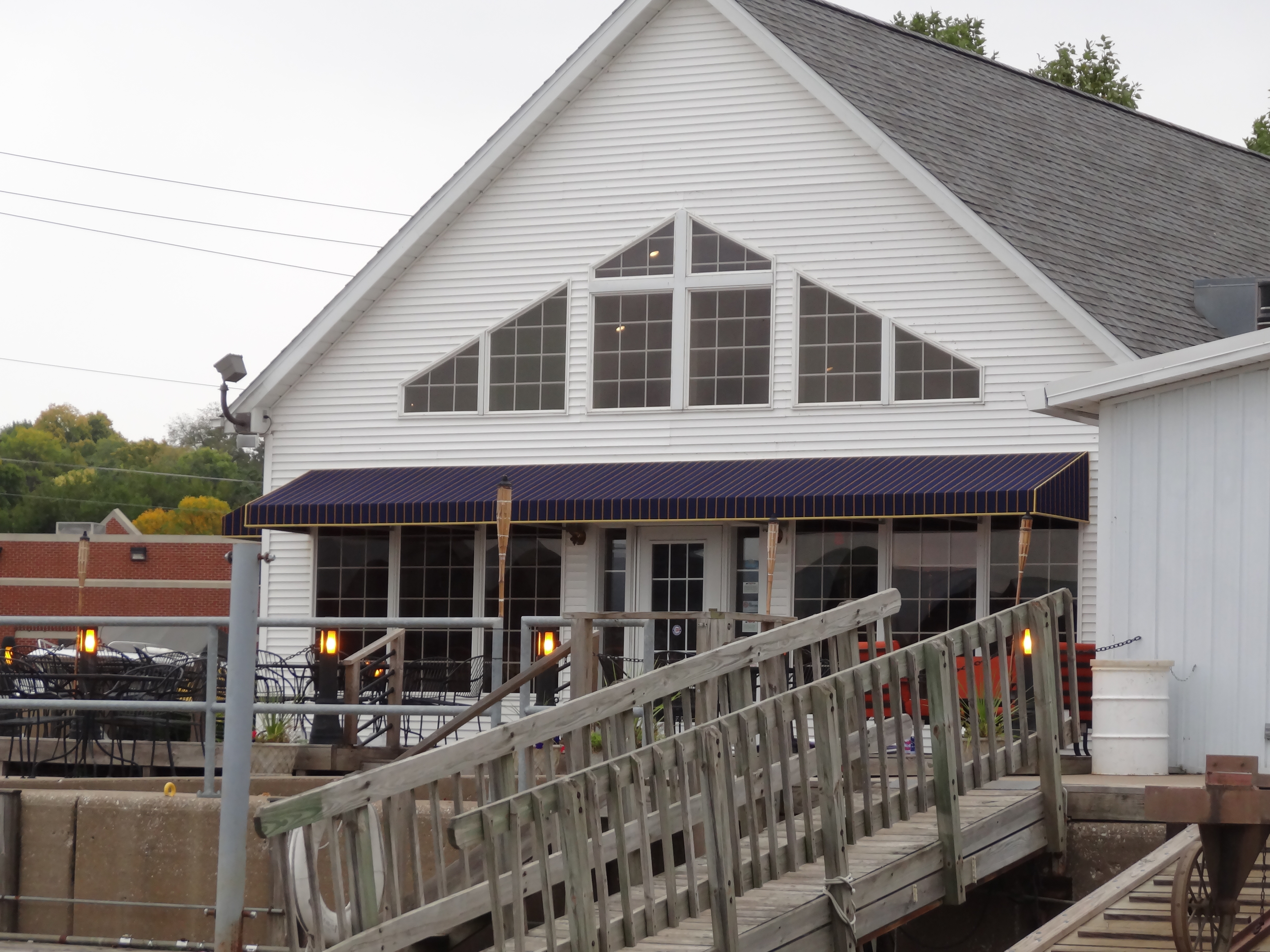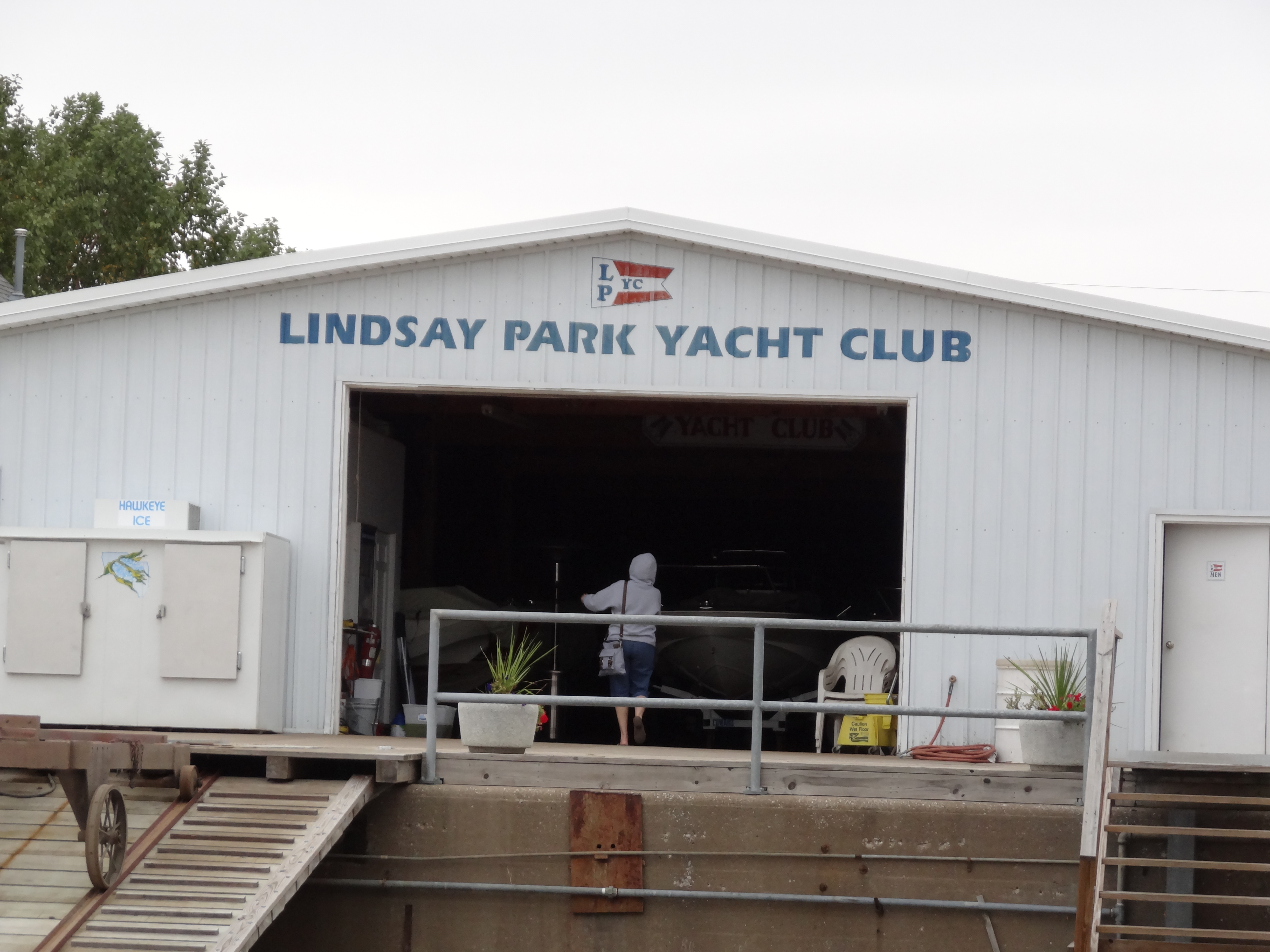 I learned a few things in our past few days of travel.  Don’t always trust what is in the Quimby’s.  A marina that we were going to stay at was not open and another that listed a 3 foot minimum depth had plenty of water.  We are currently in Davenport IA at a wonderful marina called Linsay Park Yacht Club.  Mile Marker 484.0.  They just had the marina dredged so there was plenty of water for us.  They have a restaurant on site that we had dinner at.  Very good, big portions and reasonably priced.  They have a bunch of Yacht Club flags there and the one for the SCYC was flying.  Cool!  Here are some pictures of the marina, restaurant and a cool Chris Craft that is next to us: