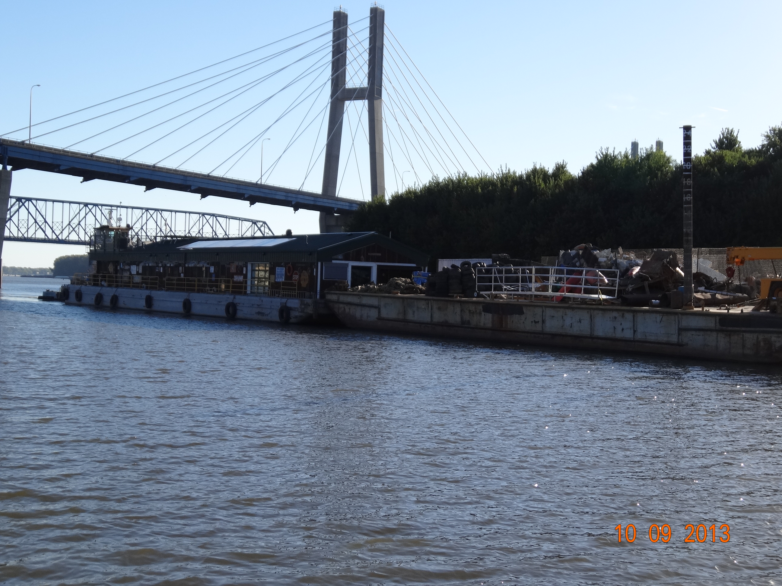 As I was sitting here downloading pictures, this tow comes buy with a few barges attached to it.  It looked like it has a bunch of junk on it.  Gary seemed to recall that some guy got a grant or something to go around and clean up the Mississippi.  While we watched they turned off the Mississippi and came down the small channel we were down.  I didn’t think they’d fit but they did.