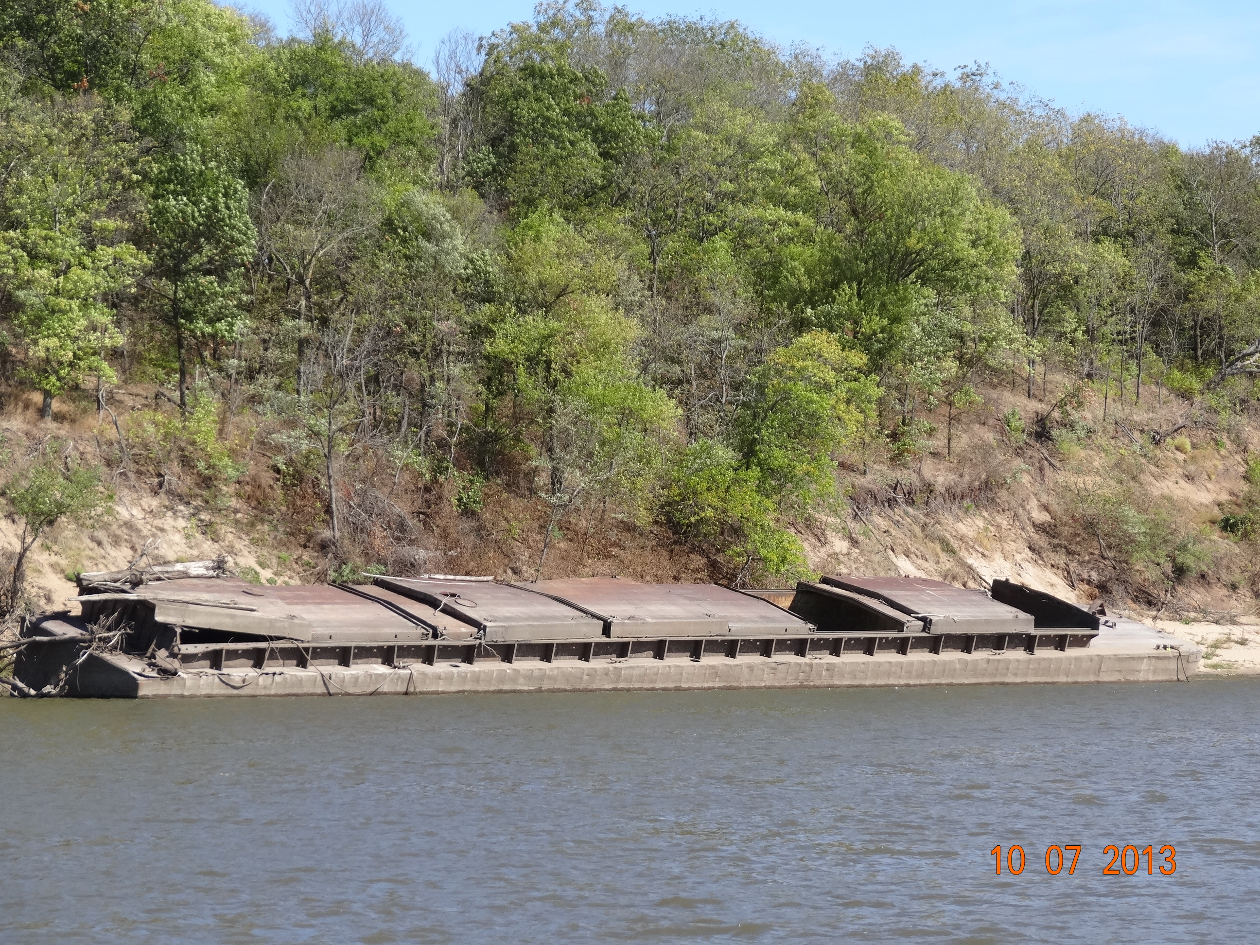 By Montpelier, IA, there were large clusters of barges just sitting on the side of the river, anywhere from 10 to 24 barges just sitting there.  We have seen more and more barges that are just sitting on the side of the river.  This one looks like it has seen better days.