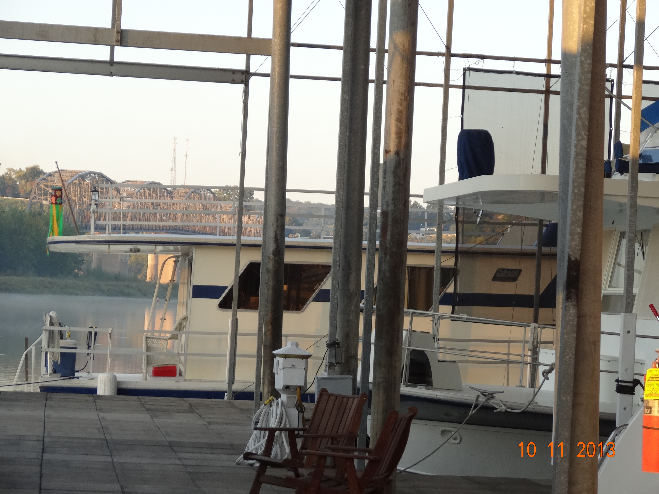 The river so far has been dead calm which is always good and makes for easier driving. We went thru locks 21 and 22 but there is no 23, kind of weird. Luckily we got right in to both of those. We have been very fortunate so far with the locks. Haven’t had to wait too long for them. We arrived at Two Rivers Marina at Rockport, IL. The dockage was $62.50 per night ($1.25/foot). That was a nice marina. They had us stay on the front of one of their docks. Wow, what a dock. 12 foot wide walkways and 6 foot wide fingers. Roof. Cement. Very nice. A few of their amenities weren’t working, like the pool, restaurant, courtesy van and the wireless. But nice dock and nice people working there.