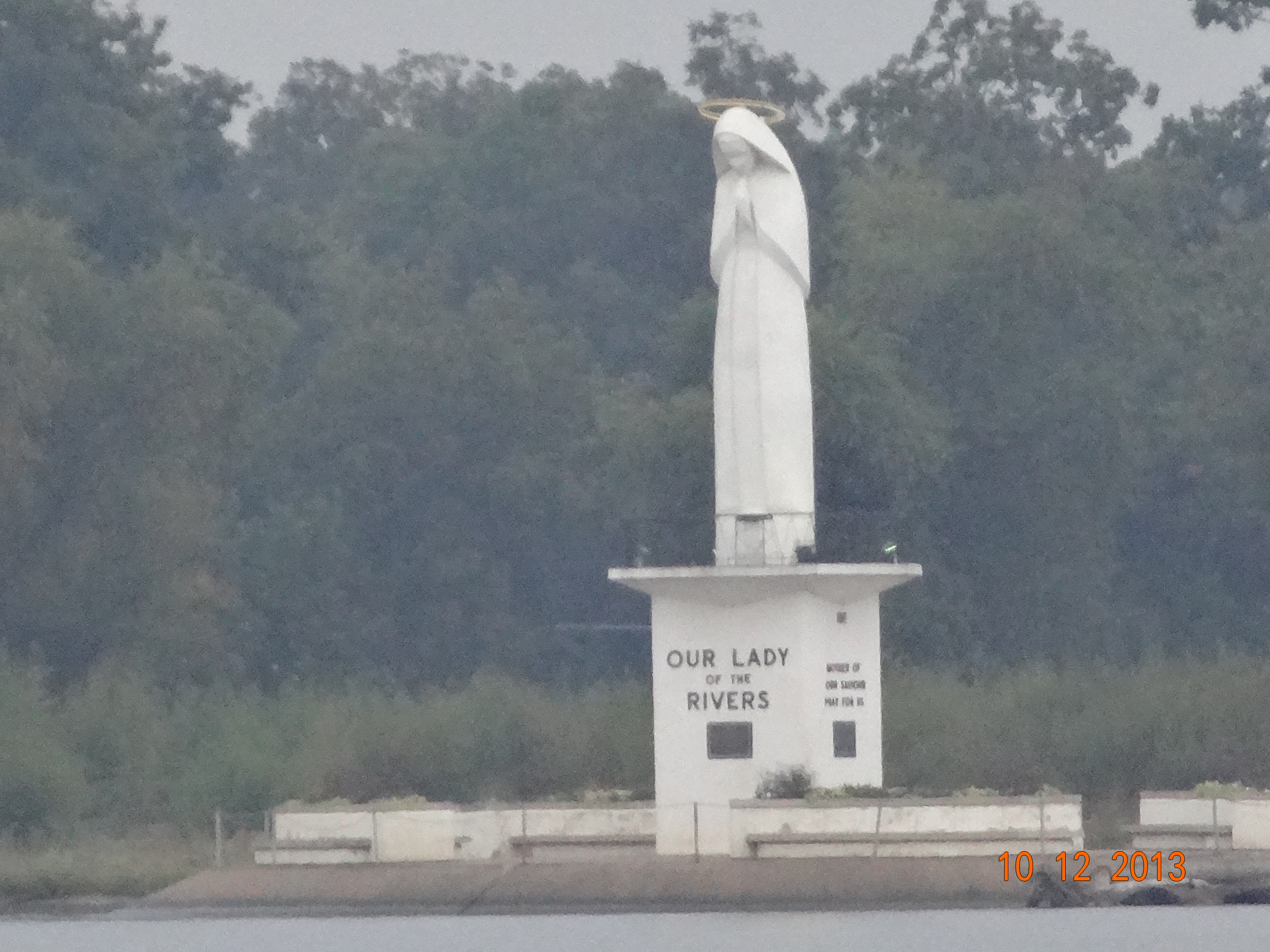 October 12, 2013 – we left Grafton at 7:45 (no rest for the wicked on this trip). Today is about 63° and cloudy and it looks like it might rain soon. We passed Our Lady of Rivers. Gary said they have a blessing of the boat there. Missed that event I guess, oh well.