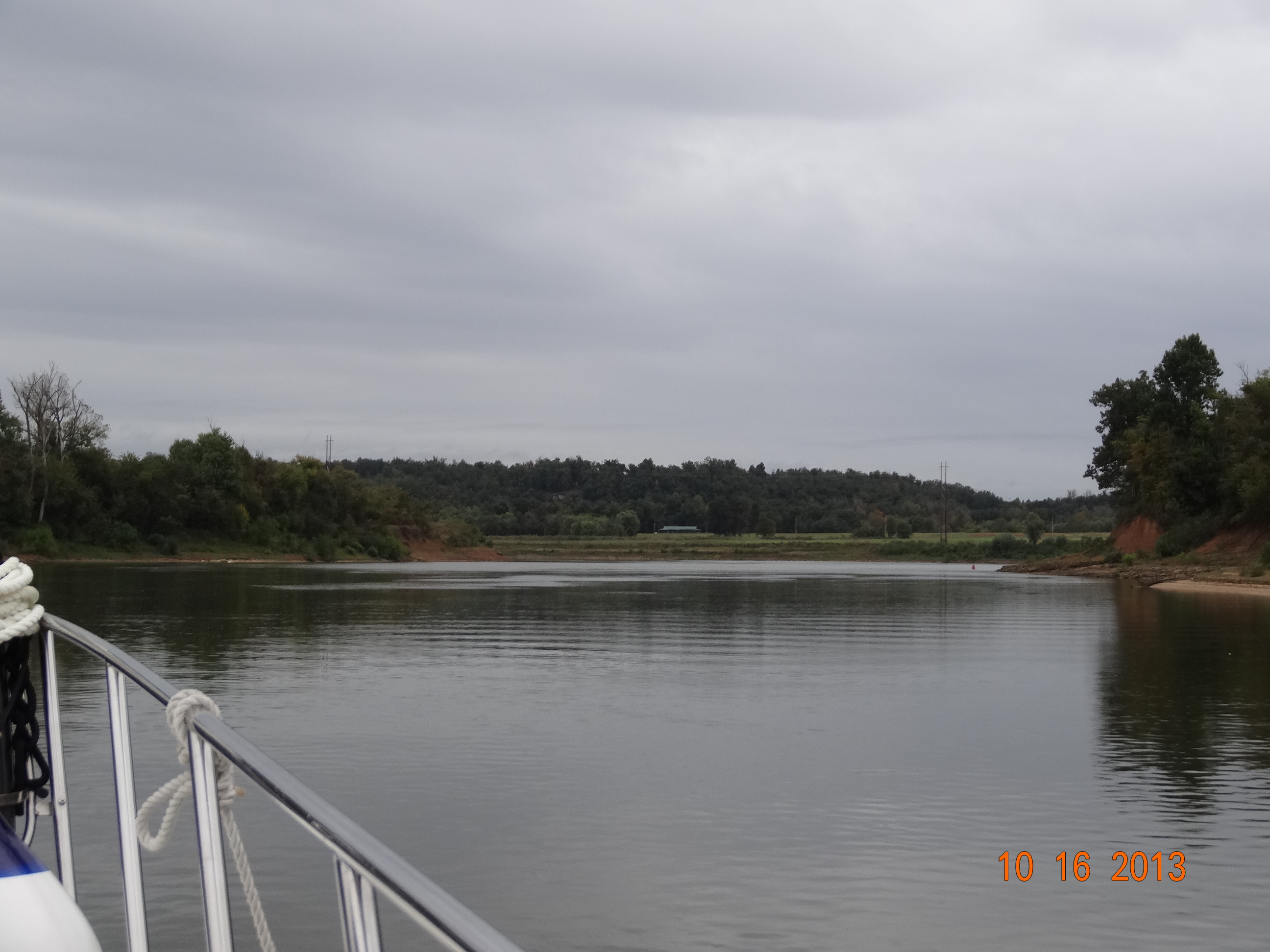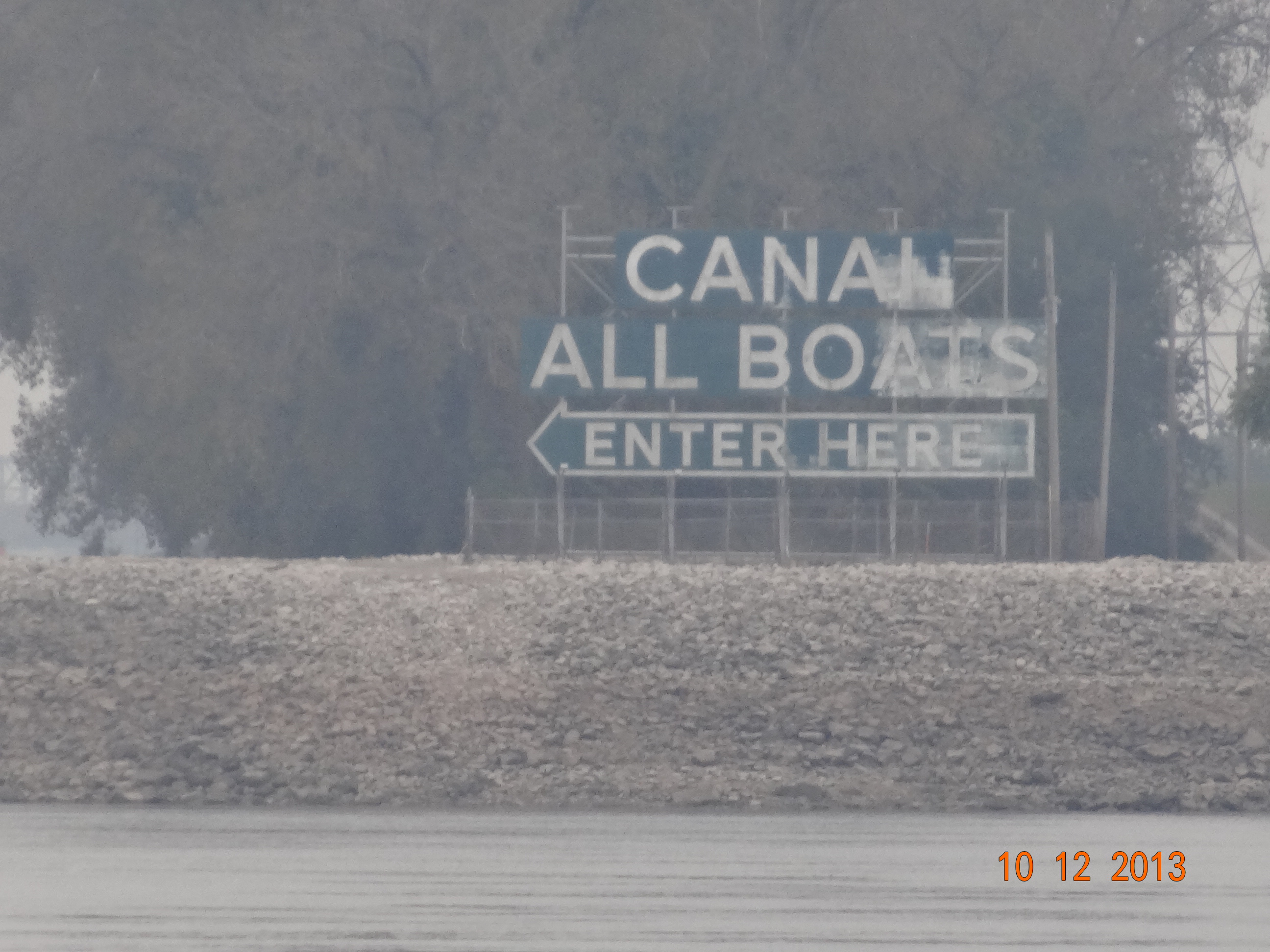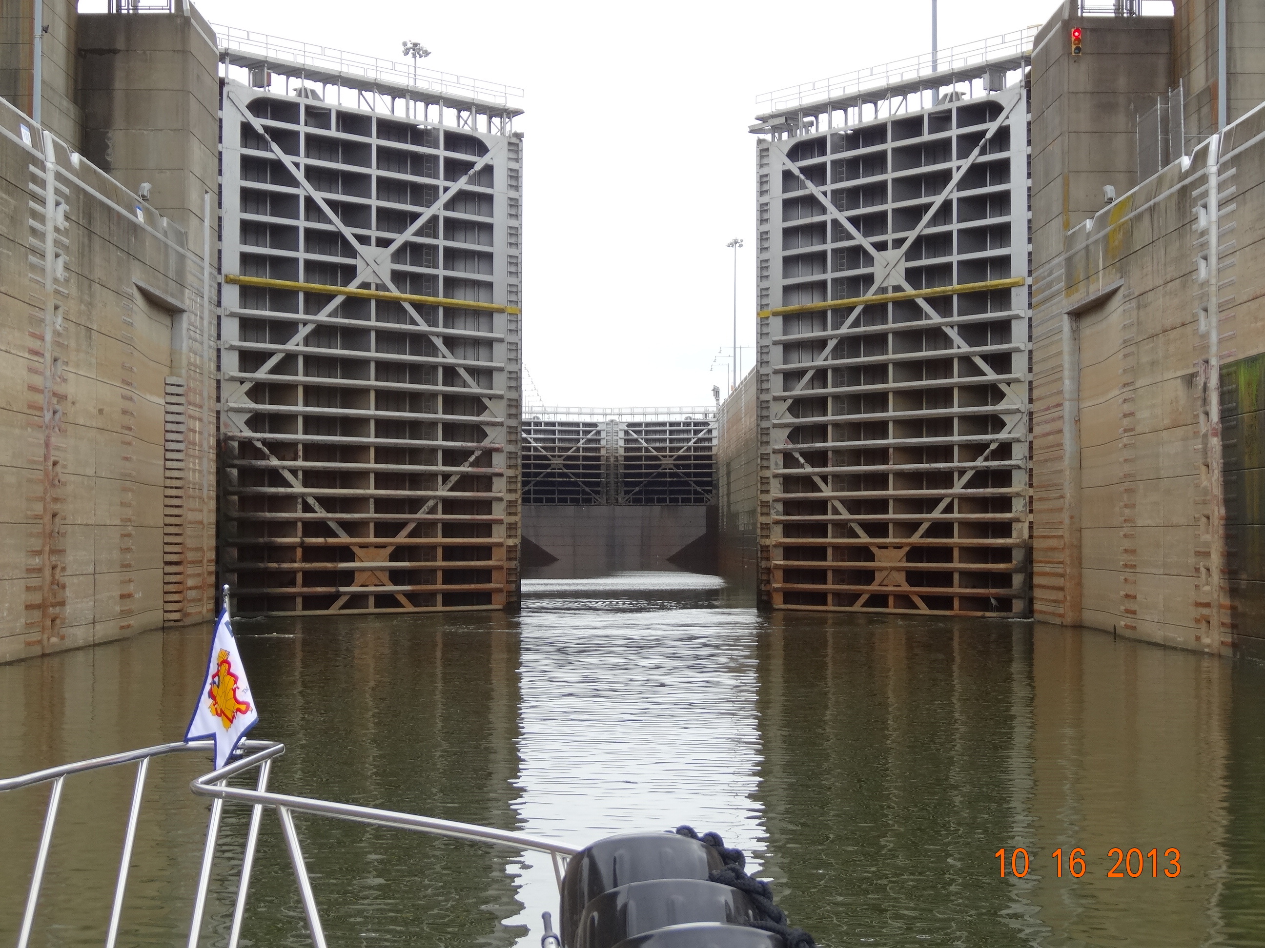 October 11, 2013 – We left Two Rivers Marina at 7:40 and continued our journey. The first lock we came to was 24. It was like a ghost lock. Once we got in, no one came out of any building so we figured we should just float in the middle again. We thanked them but no response. I guess they didn’t have their morning coffee yet. We locked thru lock 25 and got the same reception as lock 24. We started flying our AGLCA flag today, could that be it? It is windy today and about 68°. There is less stuff to look at and entertain us but we are definitely not bored. There is a lot to do when you are driving the boat. Watch the gauges to make sure nothing is over heating, keep your eye on the Garmin to make sure you are going the right way, stay between the buoys and watch for logs in the river. There have been a few times we had to dodge logs. It is good to stay alert.