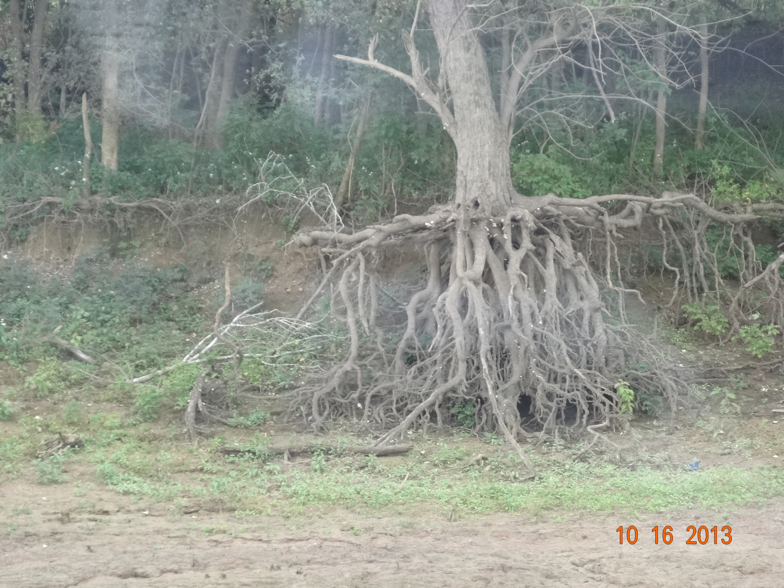 October 13, 2013 – We are going to travel about 80 miles each for the next two days and stay at anchorages Vern told us about. Apparently the place Gary stopped at in 2006 that was like a drainage channel is silted in so that is why Vern suggested these other two anchorages. As we traveled on the river we sat on channel 13 on the marine band. This is the channel the tows sit on, that way we can kind of keep track of them. There were 3 corners where you had to announce yourself before you entered the corner because you didn’t want to meet a tow in the corner because they could take up the entire width of the river. When you travel thru those tight curves, the water gets all swirly and the water drops off to 50 to 65 feet! It is kind of hard to maneuver thru these curves with the swirls. When you pass a north bound tow, because they are fighting the current, they push up a pretty big wash. You want to make sure to don’t travel in their wash as they can swirl up logs and junk that you for sure don’t want to hit.