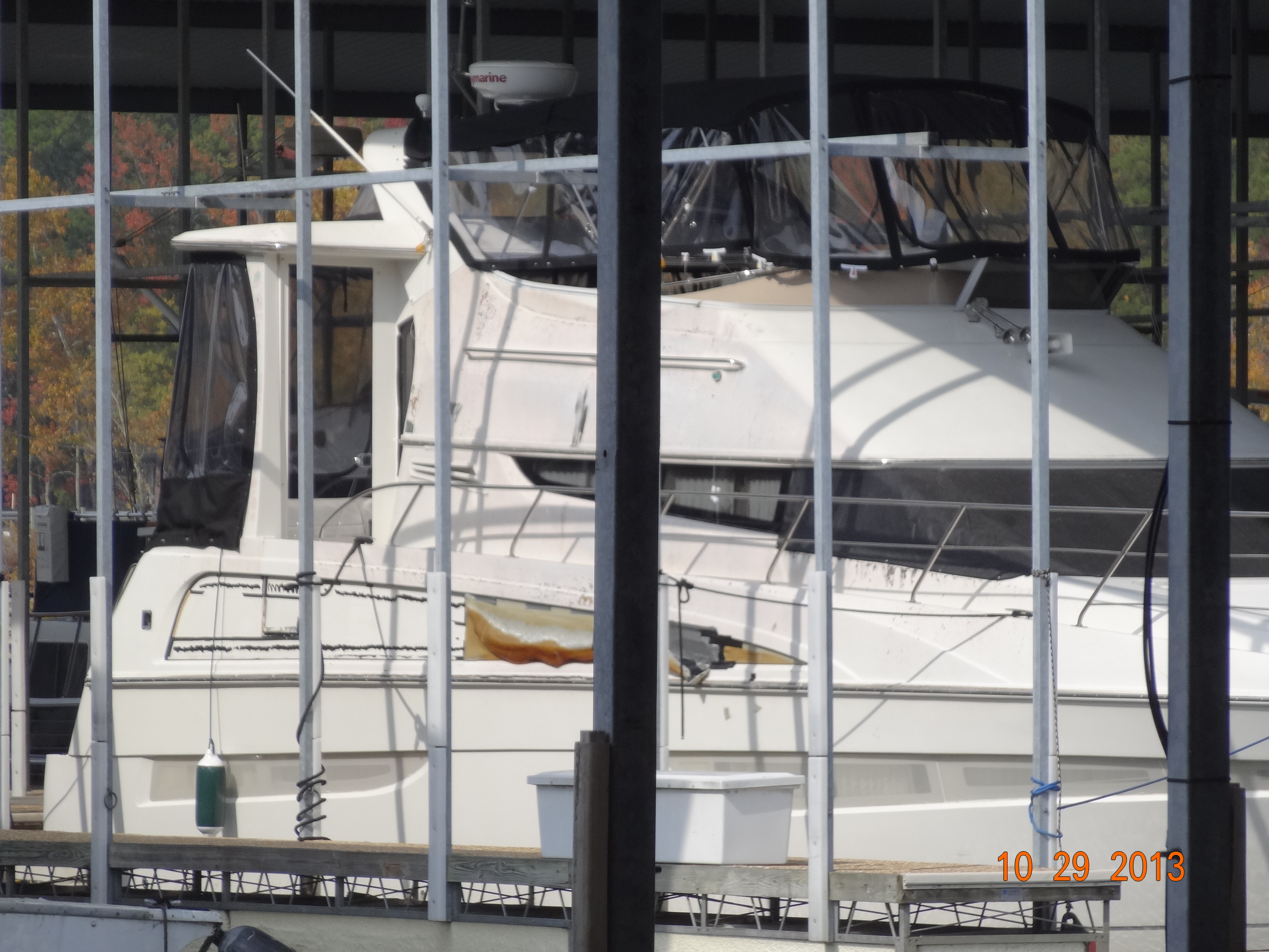 This boat was severely burned on the starboard (right) side.  We first saw this boat about 5 years ago when we were in the area looking at a boat and stopped into Aqua to check it out.  I didn’t want to be too obvious when taking the picture so you can’t see where the gel-coat is still all bubbly and flaky on the fly bridge.  That long tear drop thing should have a fiberglass insert over it, that is what the black line is, probably a glue line to hold on the missing part.  They have brown Styrofoam stuffed in the holes.  Pretty bad-looking.  You’d think by now they would have had it fixed.