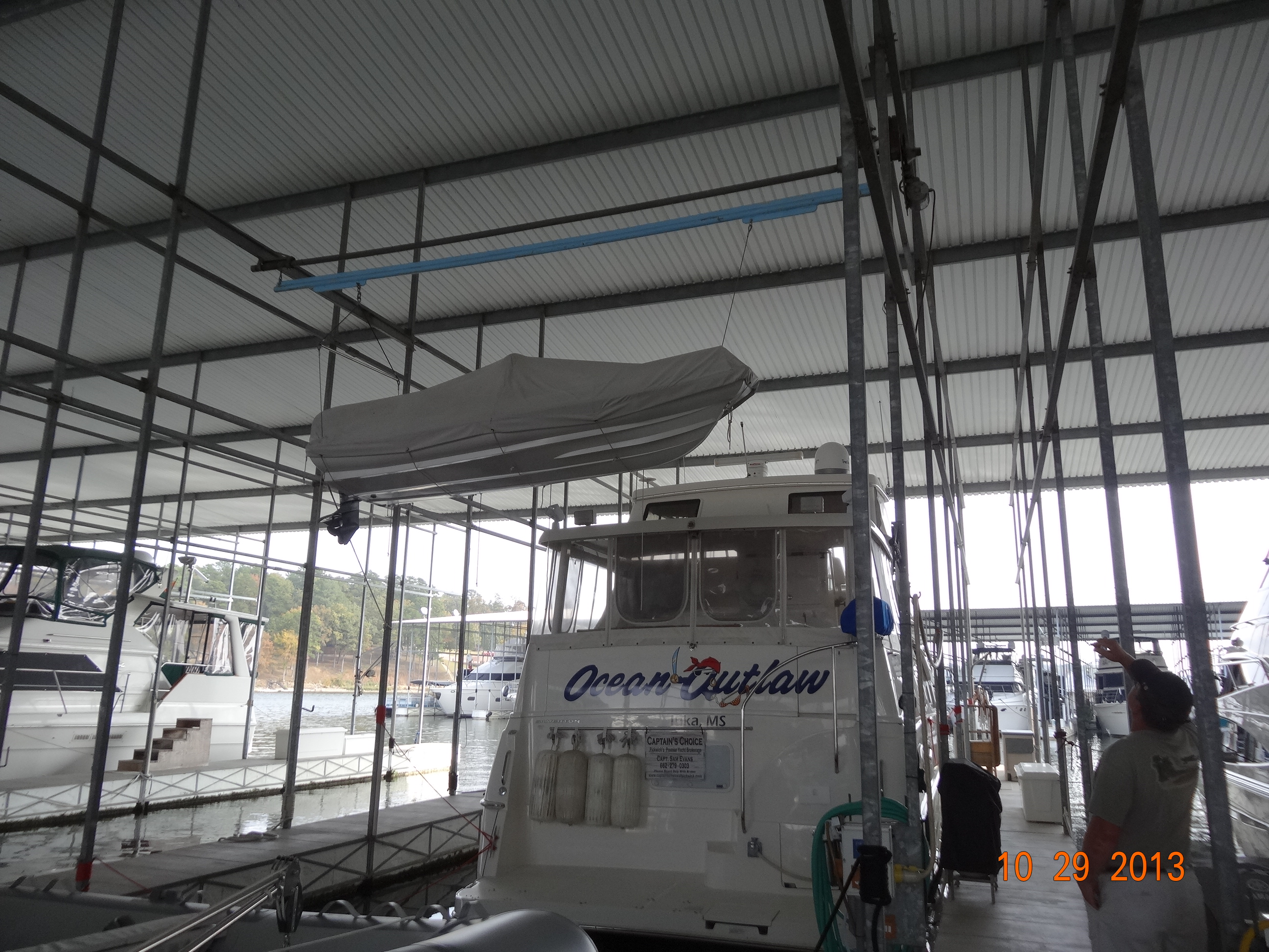 Here is an unusual way to keep your dingy (a dingy is a small boat that the bigger boats have so when they are at anchor, they can take the dingy ashore for provisions or cocktails. Whoops, did I say cocktails?  I just meant pop  :). Several marina’s even have dingy docks where people can park their boat while they are ashore).  After careful examination, we figured this contraption must have been added at the time the dock was built.  What a great idea.  Keeps the dingy hull clean and he even has enough room to drop the dingy next to big boat and get it out of the slip.  Good idea as long as it doesn’t fall 😦