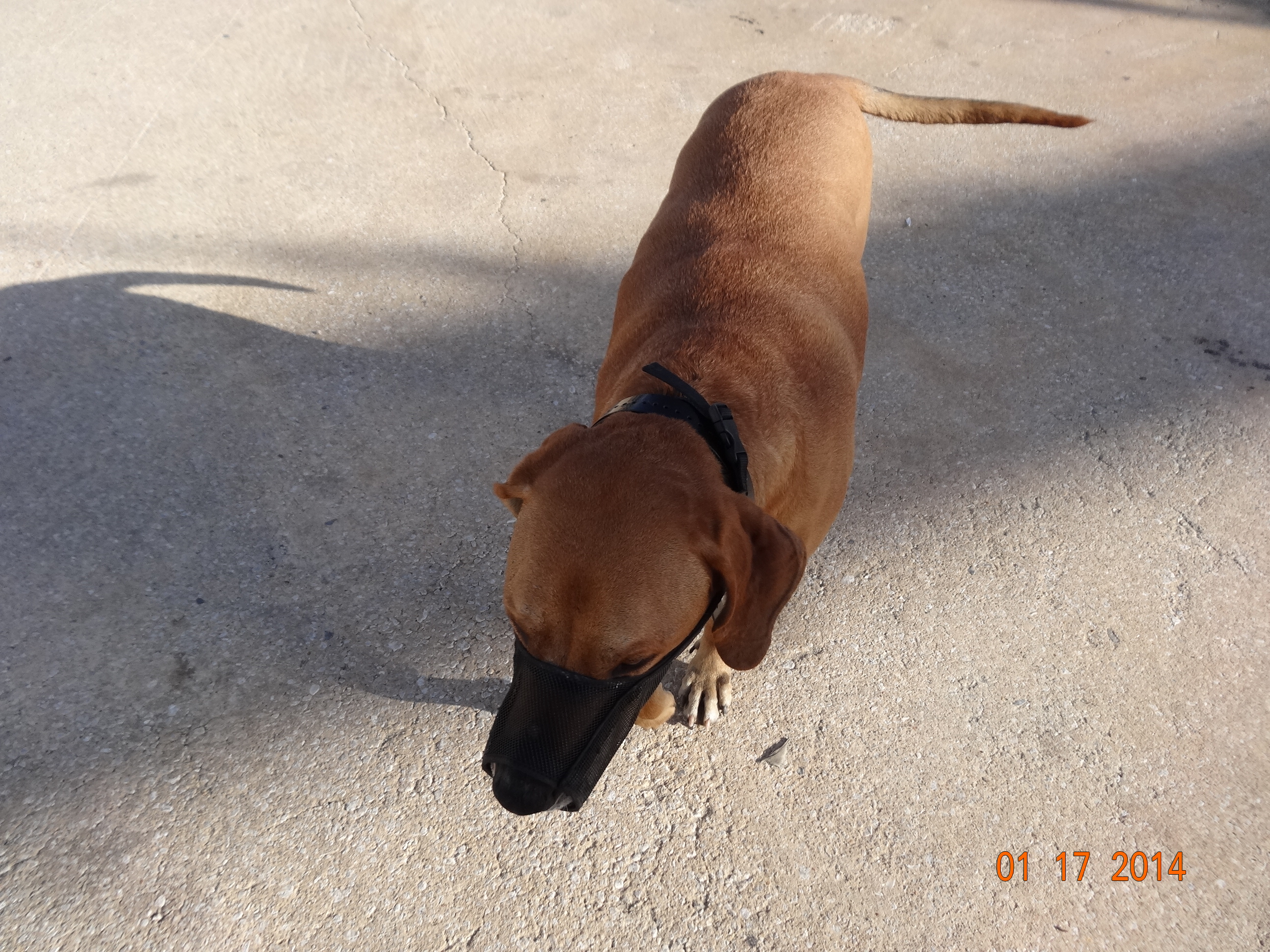 His name is Diesel. They told us he was friendly but because people are scared of such a big dog, they put a muzzle on him. I think he looks a lot scarier with the muzzle on him and with his shock collar. He reminds me of that guy in the movie Hannibal He was very friendly but very big. Once you started petting him he didn’t want you to stop.