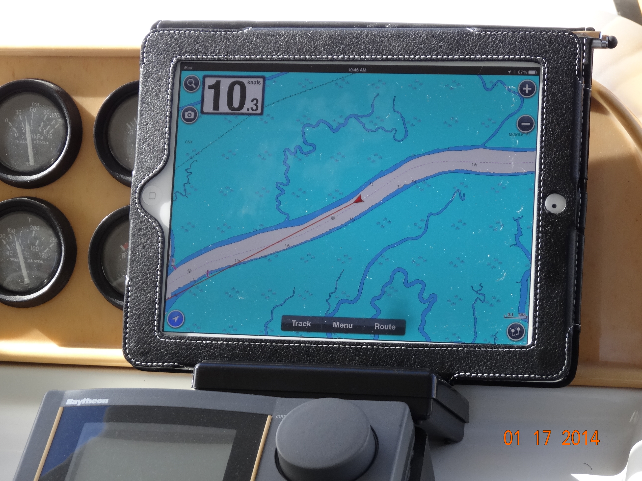 Luckily, we had downloaded Navionic’s for our I-pad. For about $50 I would suggest any boater download it. The detail on it is wonderful and as long as your I-pad is cell phone capable (so it has GPS), you don’t need to have internet coverage for it once you download all the maps. Here is what Navionic’s looked like