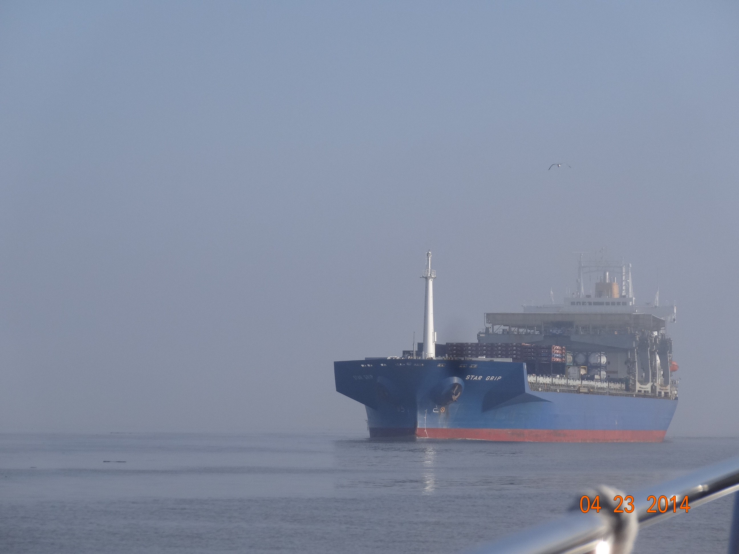 Unfortunately the closer we got to the Mobile Bay Harbor, the foggier it got.  This boat came out of the fog at us