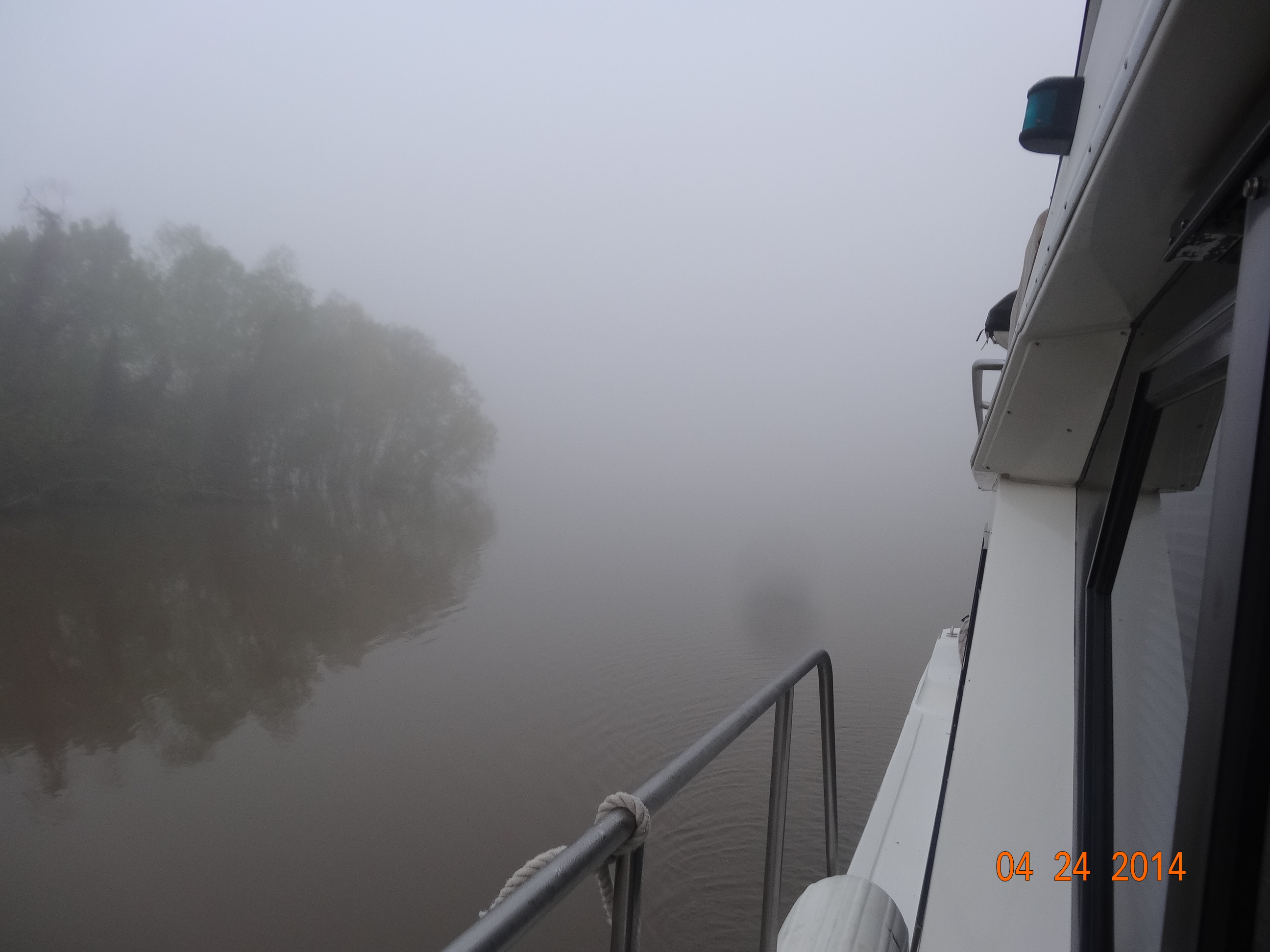We woke up at 6:00 to in dense fog.  Boo!  Looks like we will be sitting here a while.  The picture below is looking out to the river.  You can’t even see the other bank which is not that far away.