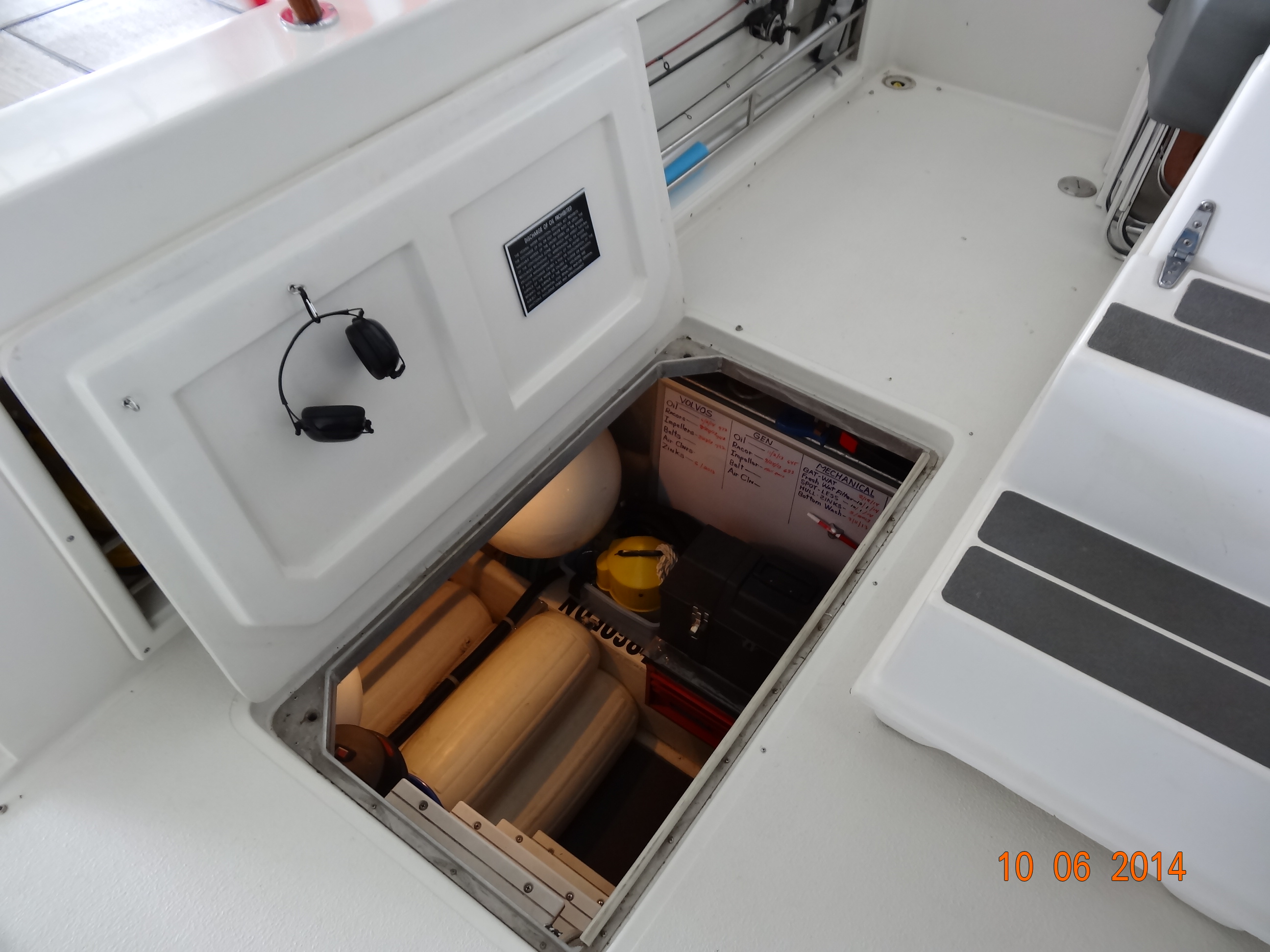 The two fuel tanks are on either side of the opening (behind the white board and behind the ladder and the fresh water tank and the holding tank run down the center of the hull. You want to make sure you don’t mix those up, that could be a disgusting problem ;).