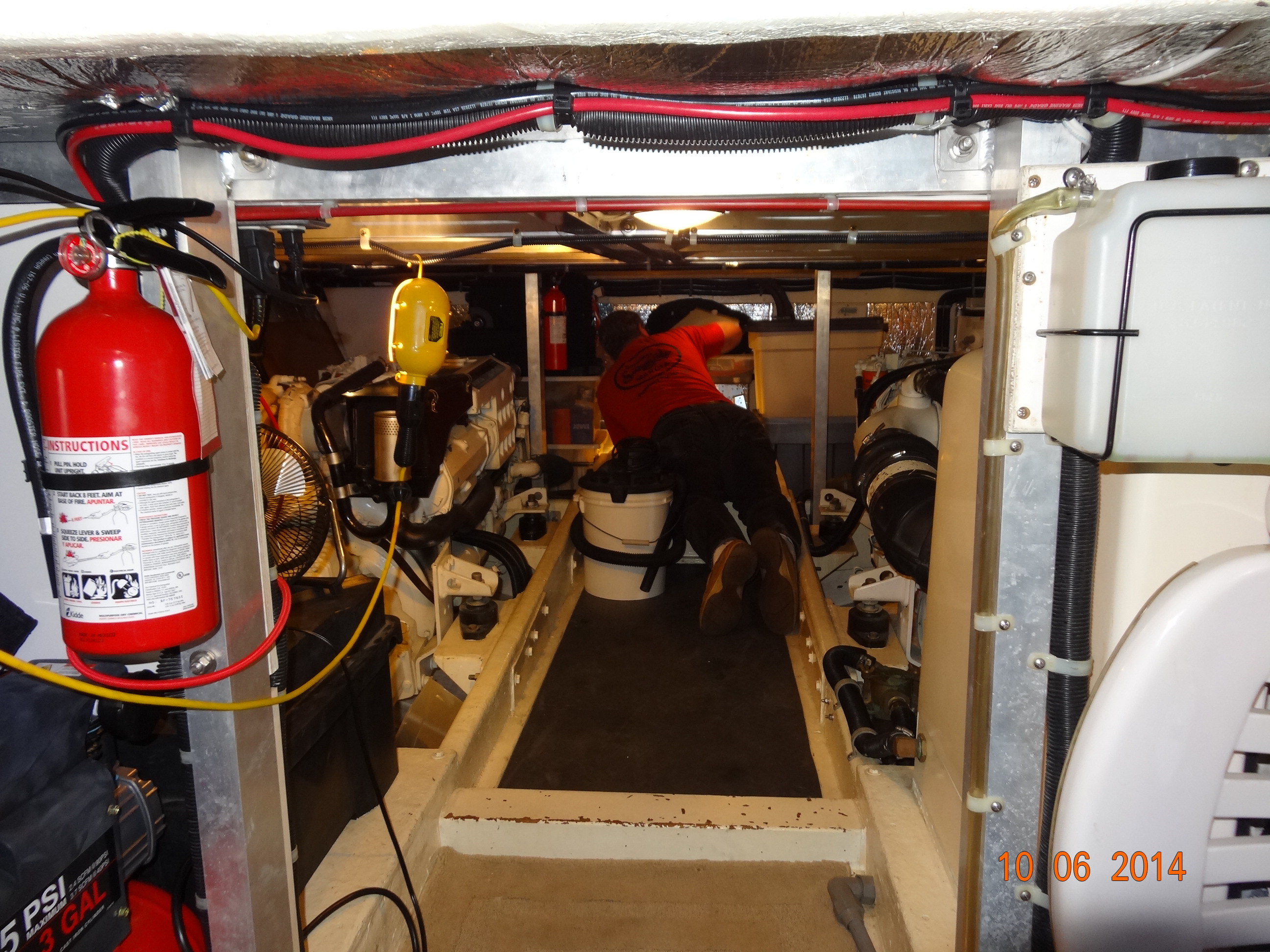 You can see where Gary hangs his ear protection and the black sign is the required “Discharge of Oil Prohibited” plaque that is required by the Coast Guard. The ear protection he wears it when he is working down there when the engines are running, at least I hope he does or there is going to be more “what?”, “what?” going on :). This is our only entrance to the engine room. Some of the newer Navigators have another entrance in the Galley. Good points and bad point to that I think. Of course I’m the First Mate and I don’t want anything to interfere with my Galley!
