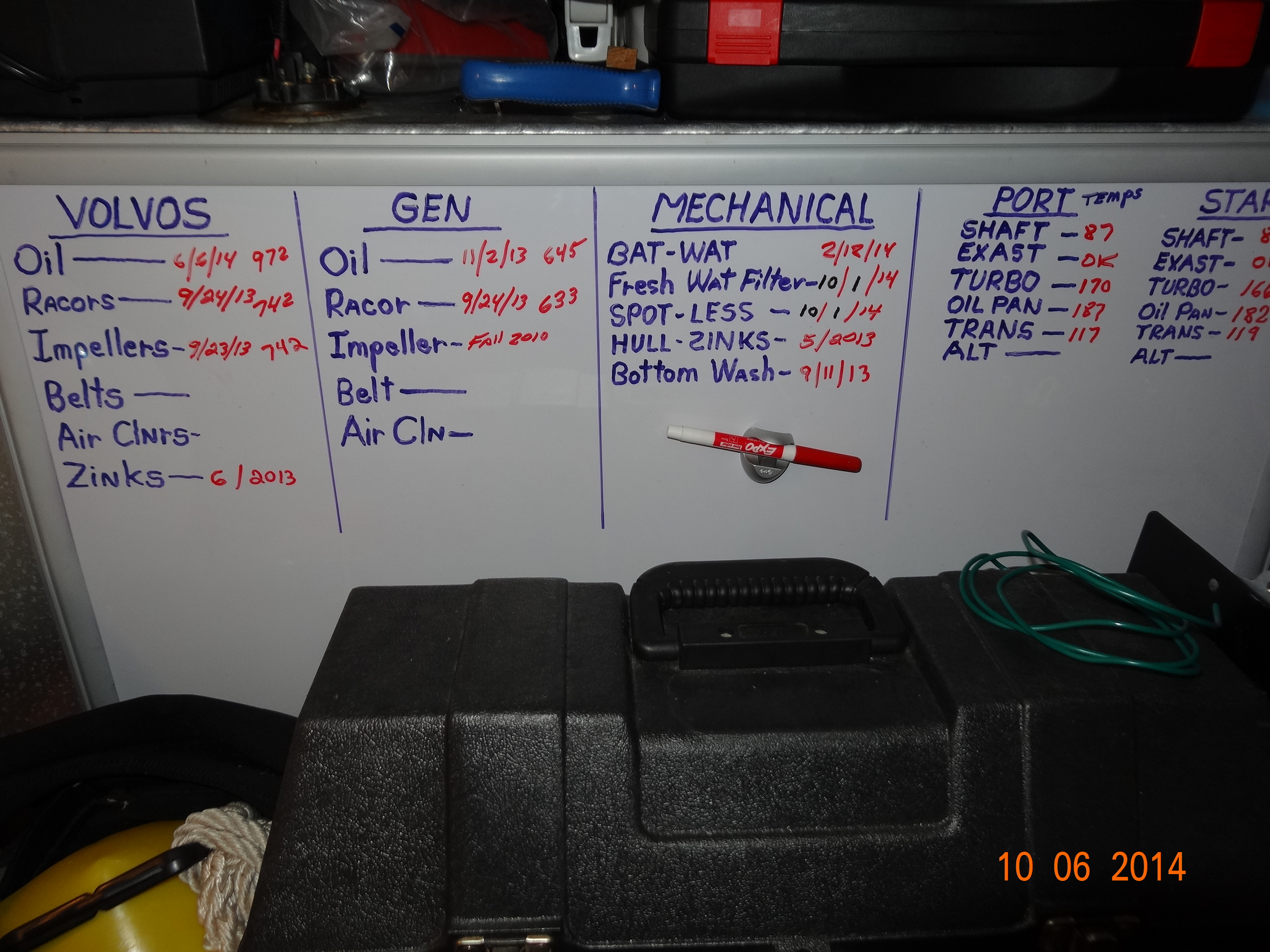 Next we have a view of Gary’s white board where he records such things as the last time maintenance was performed on the engines and generator and the temperature of various things while we are underway. We have heard many comments about his white board, mostly a lot of “Wows!” 🙂