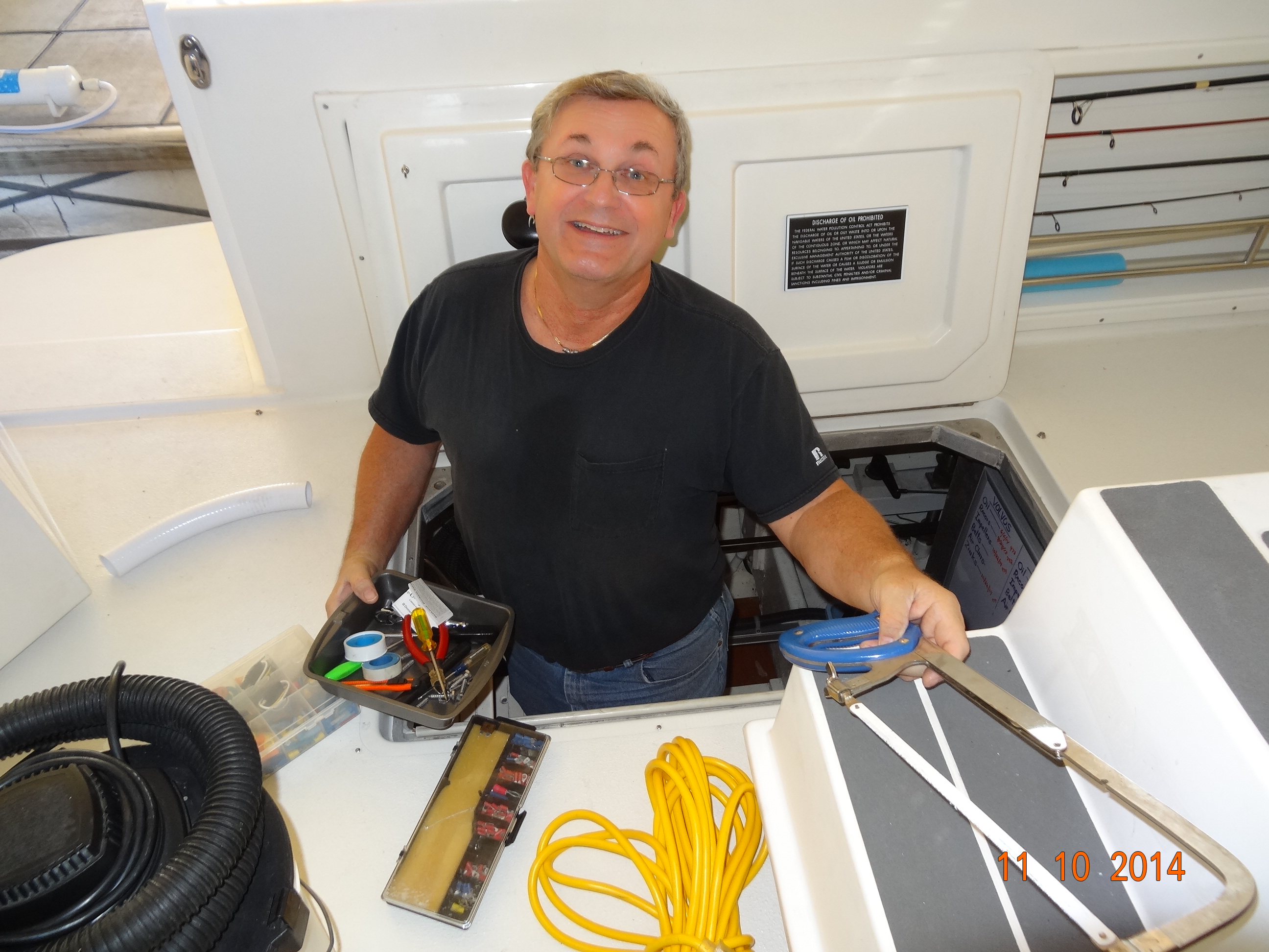 One of the problems with all these tight spaces and taking an aspirin a day, is that Gary bleeds like a stuck pig. We bought him some elbow pads to help with part of his arm, but the bottom got gouged by a hose clamp. Watch out for those, they can do some real damage to your body parts.