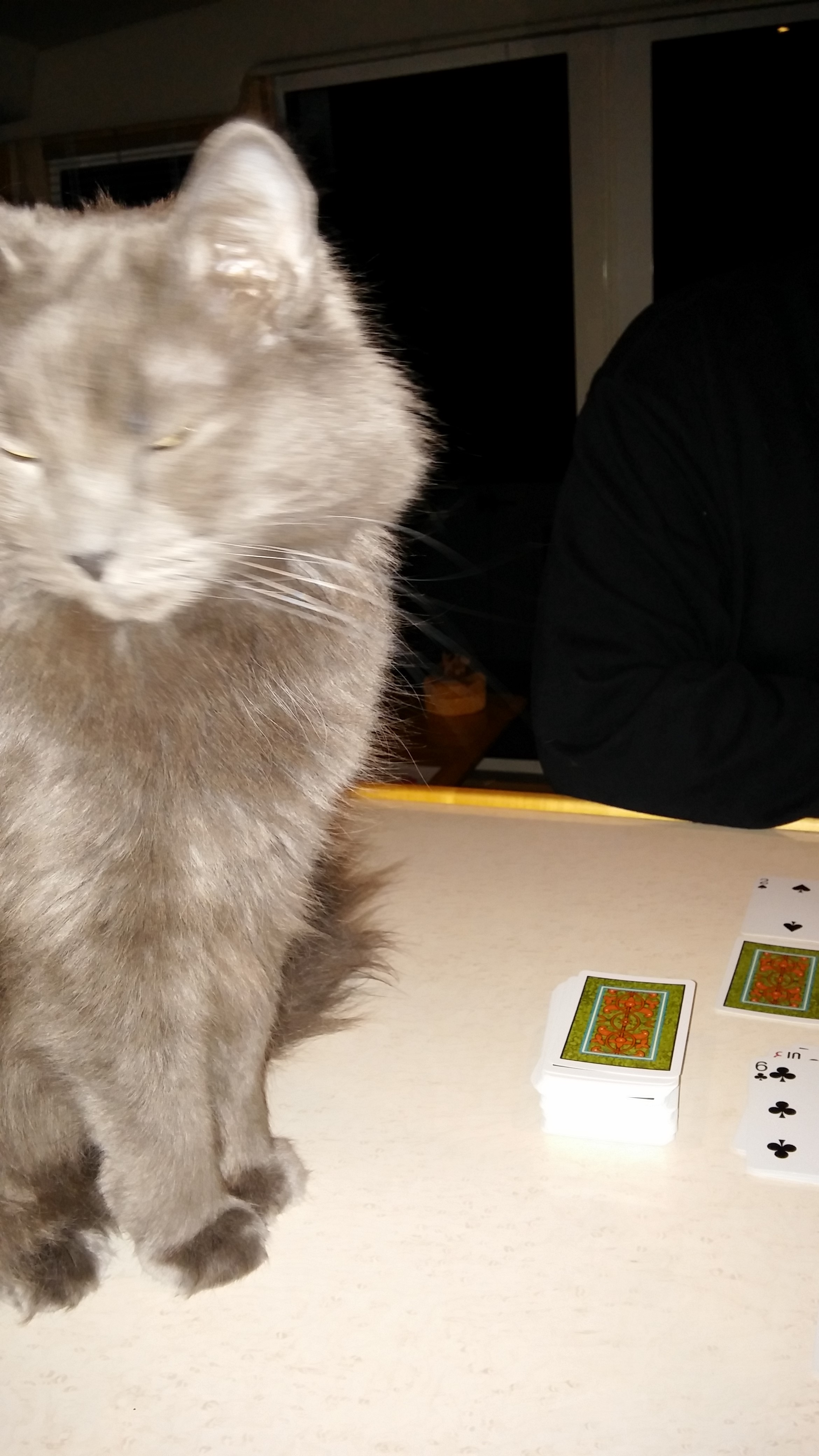 Of course at night, with no power, we have to run the generator and find ways to amuse ourselves. I’ve suckered Gary in to playing a few card games we have learned along the way. Even the cat likes to get in on the action.