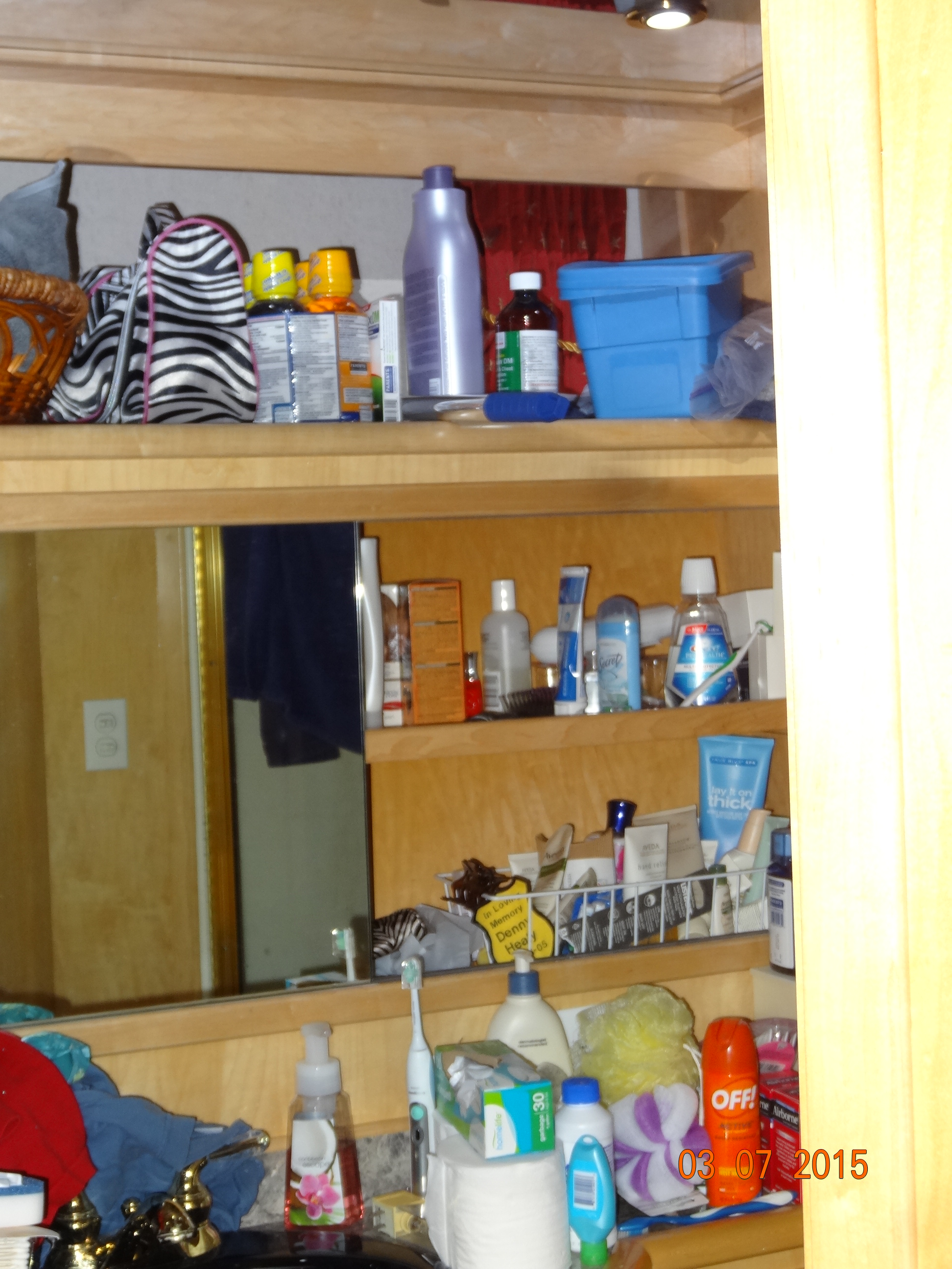 Look at all that stuff. (I’ve come to the conclusion that when I stocked the boat I thought we were going to be away from civilization for months at a time, cause man, I have a lot of stuff stored all over the boat. 🙂 And not just one extra back up item, several back up items.) The picture doesn’t due justice to what I had stuffed under that little sink. It is surprising how much you can fit into a small area.