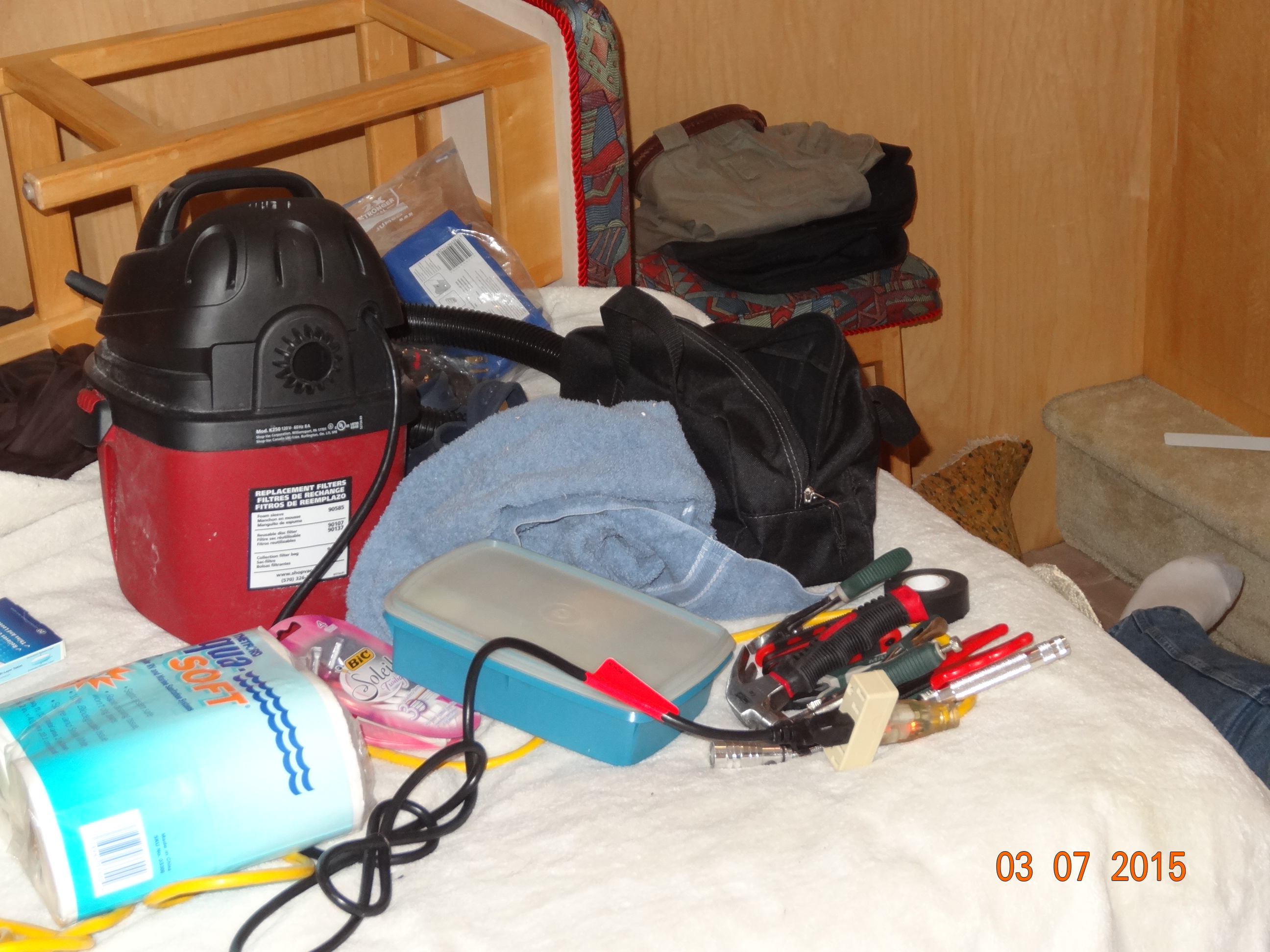 Luckily our carpeting and pad can just be pulled up so we can see what is going on. Gary did just that. We propped the carpet and pad up with spare shoes, turned a fan on it and plugged in the de-humidifier to get it to dry. Gary put on his thinking cap while the carpet was drying and decided he needed to make a trough that the water could run in and then feed it to the bilge where it could just be pumped overboard, thereby keeping the carpet from getting wet again. Gary was just getting ready to do start the job