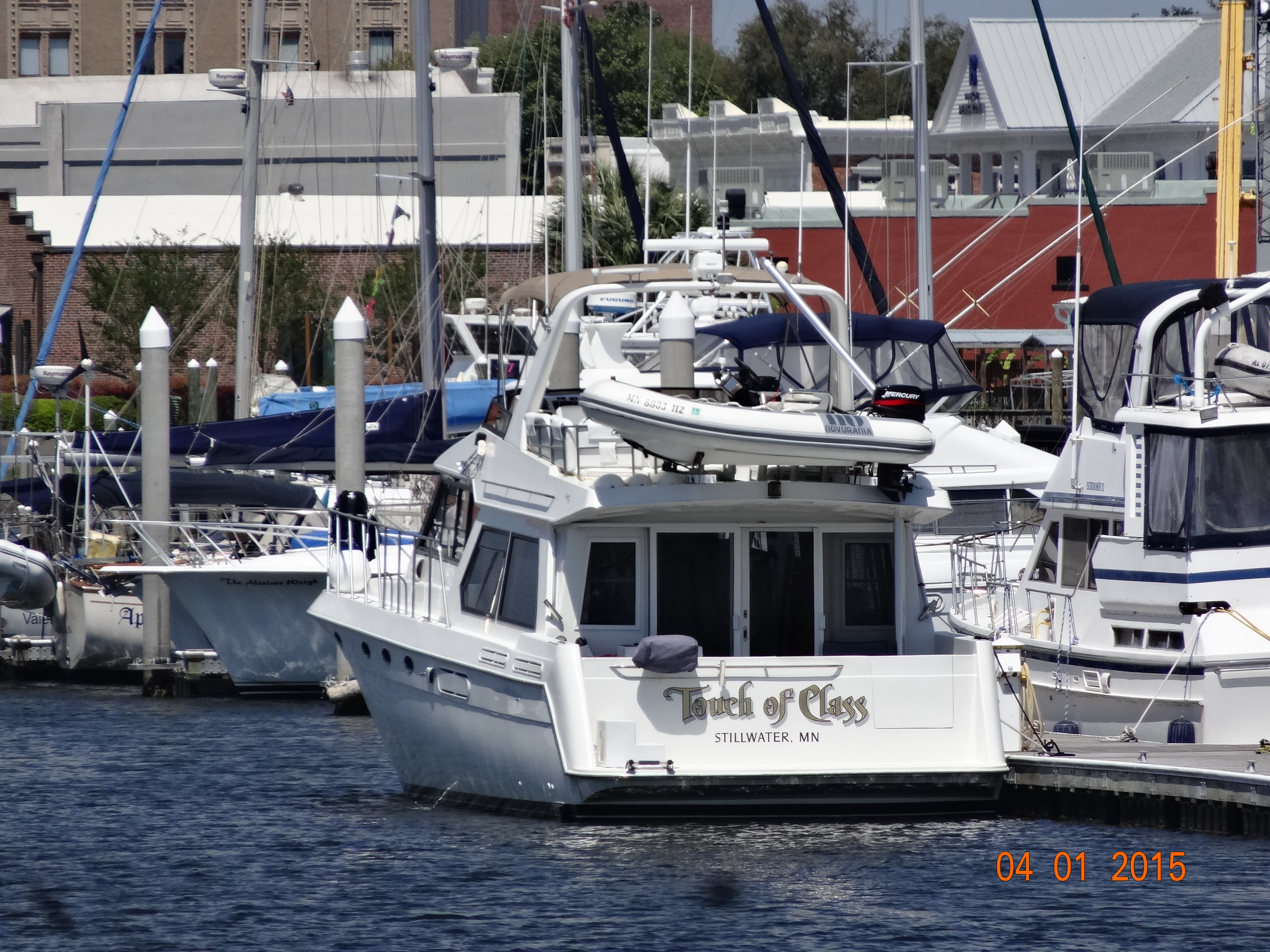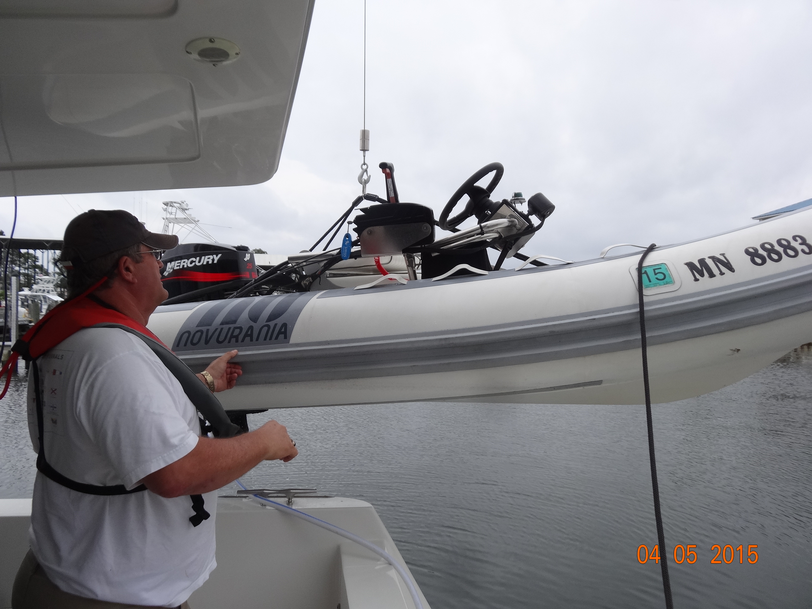 With the salt water down here you have to be careful to wash the salt off everything. The old Touch of Class even carries the muffs to put on the outboard to flush out the engine on the little boat. All went well and it hoisted real nice and in the correct spot. That was well worth the money.