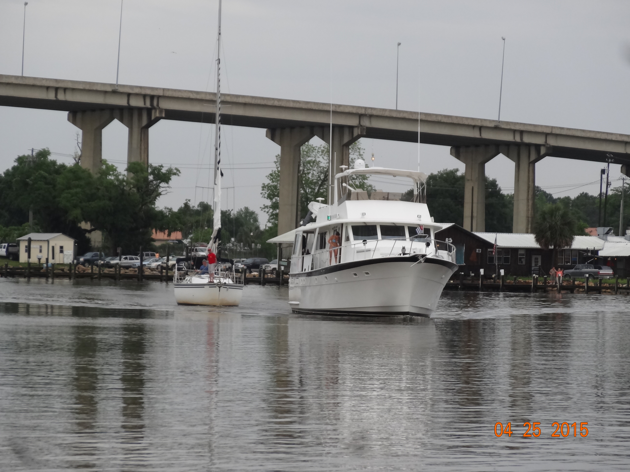 We had smooth waters sailing to Dog River, our first stop. When we got there we filled up at $3.13 a gallon and took our free night dockage. We heard that a big storm was coming tomorrow night and the water levels were pretty high on the Tenn-Tom so we decided to stay and not leave till Sunday A.M. All morning on Saturday we watched sail boats leave the harbor. Apparently there were 130 boats sailing in a Regatta that day. Looked like a beautiful day until about 4:30 when it started to get dark. The storm was coming. Luckily Gary had put out some extra lines because there were 60 to 70 MPH winds. Our boat was being pushed sideways by the wind and the rain was whipping. Unfortunately we didn’t put up the Bimini, we watched as the tubing collapsed back on the radar arch and the Bimini flapped around in the wind