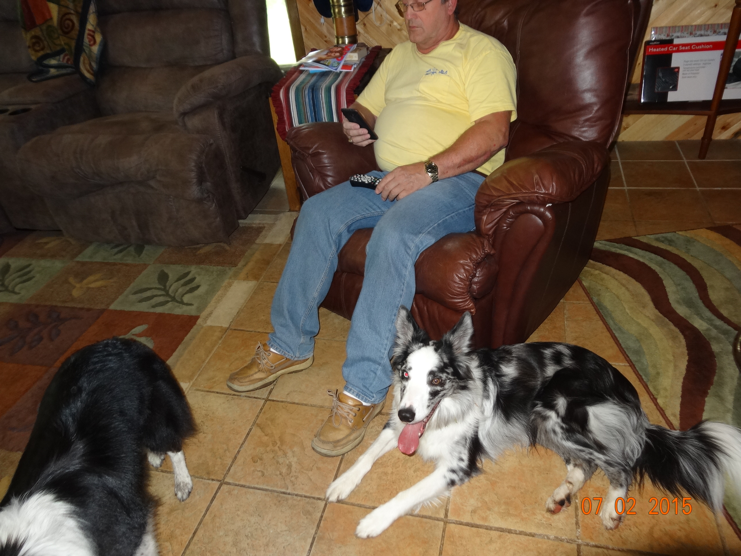 We spent a few days up at Beartrax again this year over the 4th.  My brother and his wife run the store that is open 365 days a year, 6:30 to  6:30 every day.  Of course they have lots of good help but as this is a very busy time for them, we go up to help where we can.  We tried to make sure they had hot meals on the table at the end of the day and something to eat during the day to keep their energy up.  Their home is in the back of the store so we go there to make the meals and for a little break.  We also did a little baby sitting while we were there, here is Gary watching over a couple of the kidsDSC05704 The gray and black one is a border collie called YooHoo and he is deaf!.  They have taught him hand signals for things like, “go potty”, “sit”, “come” and “down”.  When they first got him, they would take a flash light with them when they would let him out at night.  When it was time to come in, they turned the flash light on so he’d come over to them to investigate the light.  Of course having a few more dogs around helped in the training as he could just follow the pack.  I think they are prejudice.  All they have are black and white dogs, 3 border collies, 1 cocker spaniel and an older poodle.  Not a Golden in sight!  Hrumph!