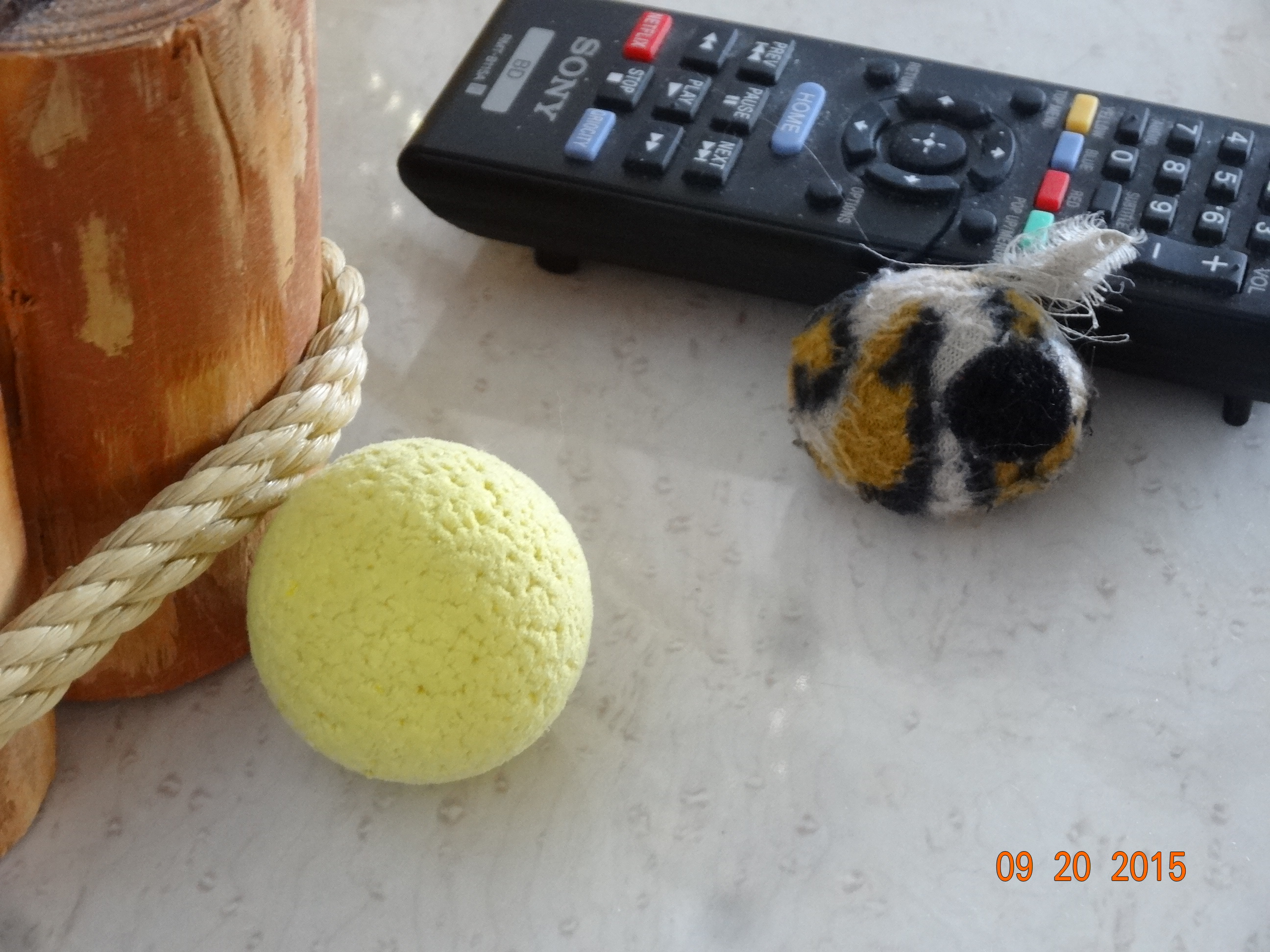 It’s the one on the right. No….not the remote! The little beat up leopard looking ball. He loves that ball. When ever we travel I make sure it stays on the boat so he doesn’t lose it cause he is always loosing it under the couch. We have a stick that we use