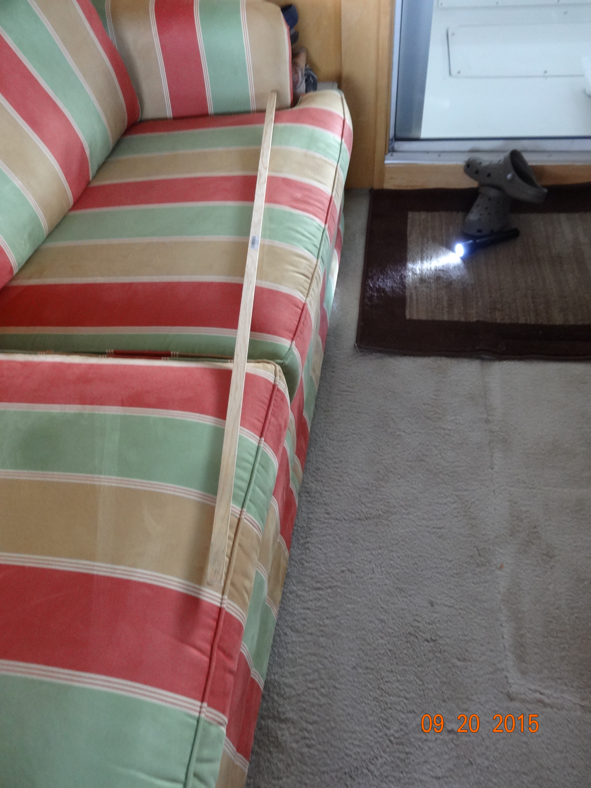 that works pretty well in getting the little ball out, plus what ever else he has shot under the couch…bottle caps, other cat toys, batteries. You just can’t drop anything on the floor without Smokie thinking it is a toy and needing to play soccer with it. So anyway, to keep him from making a goal under the couch, we bought those Styrofoam pipe covers. Ya know, those things you put on your pipes to keep them from dripping down in your basement? Yah, those. Kind of like a beach noodle. They work really good. So Gary did one last removal of toys from under the couch and then proceeded to place the foam in place
