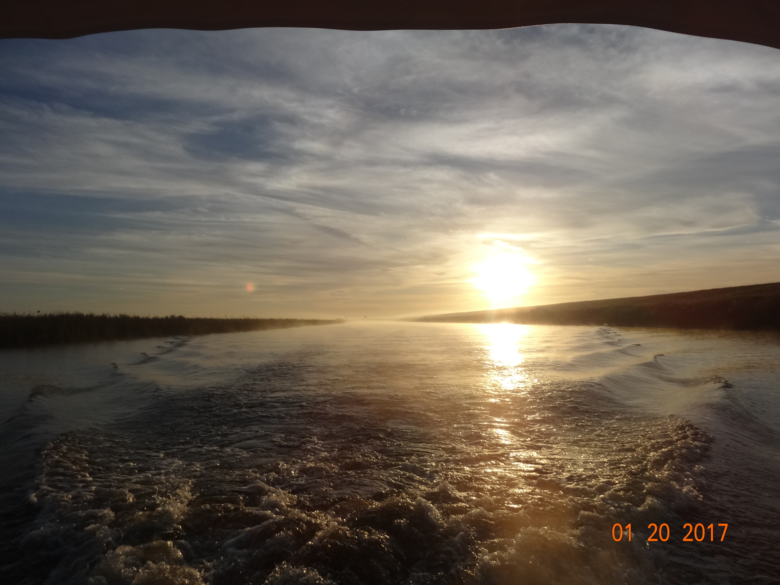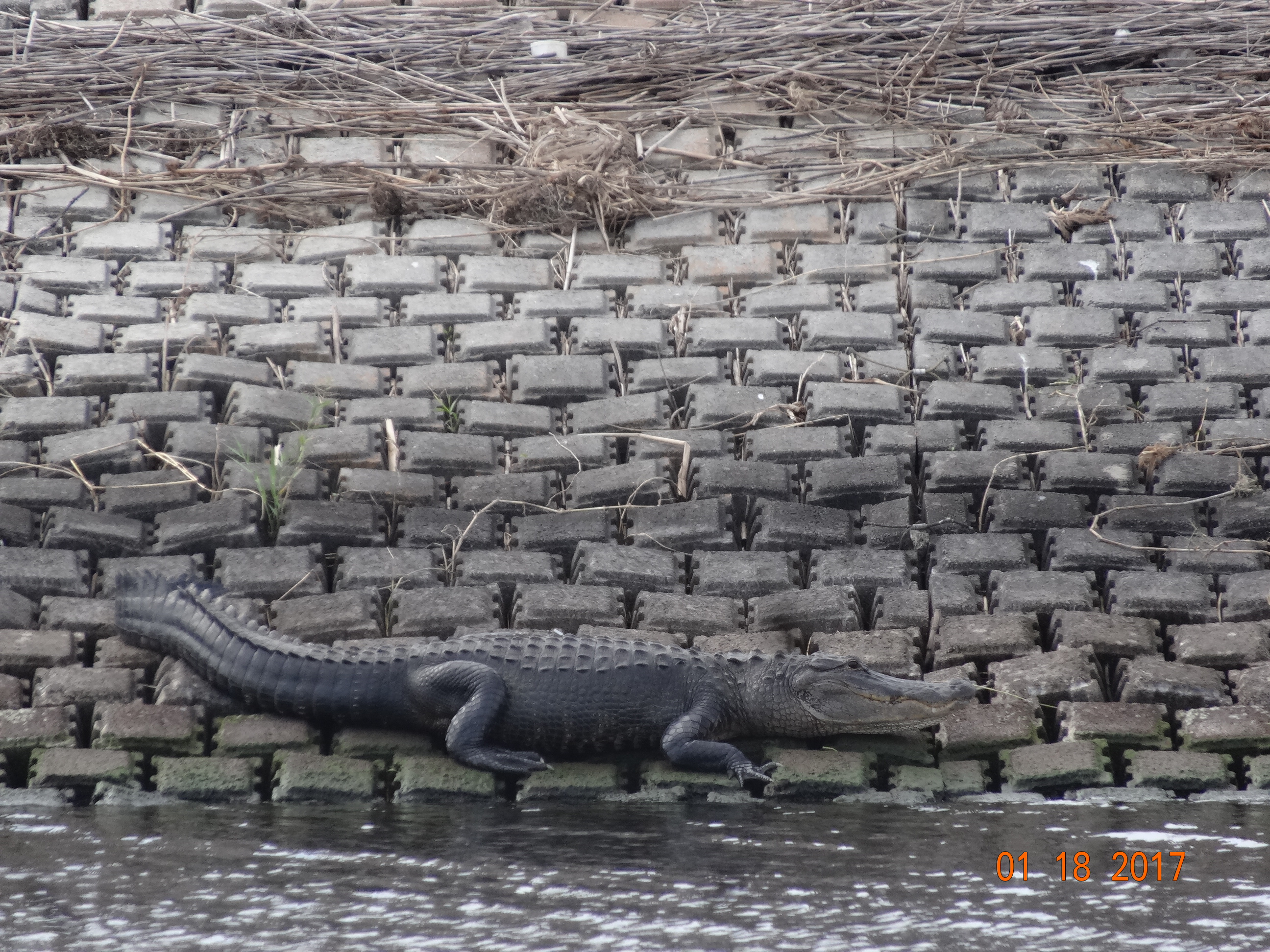 But none the less, a beautiful morning to be heading back. We again traveled about 8 MPH. The boat we were traveling went traveled at his slow speed, 10 MPH. We had to plane off every now and again to catch up to him. Going thru the locks this time was much better as they were letting the water out instead of letting it in. We did see our final alligator of the trip right as we came out of the 2nd lock