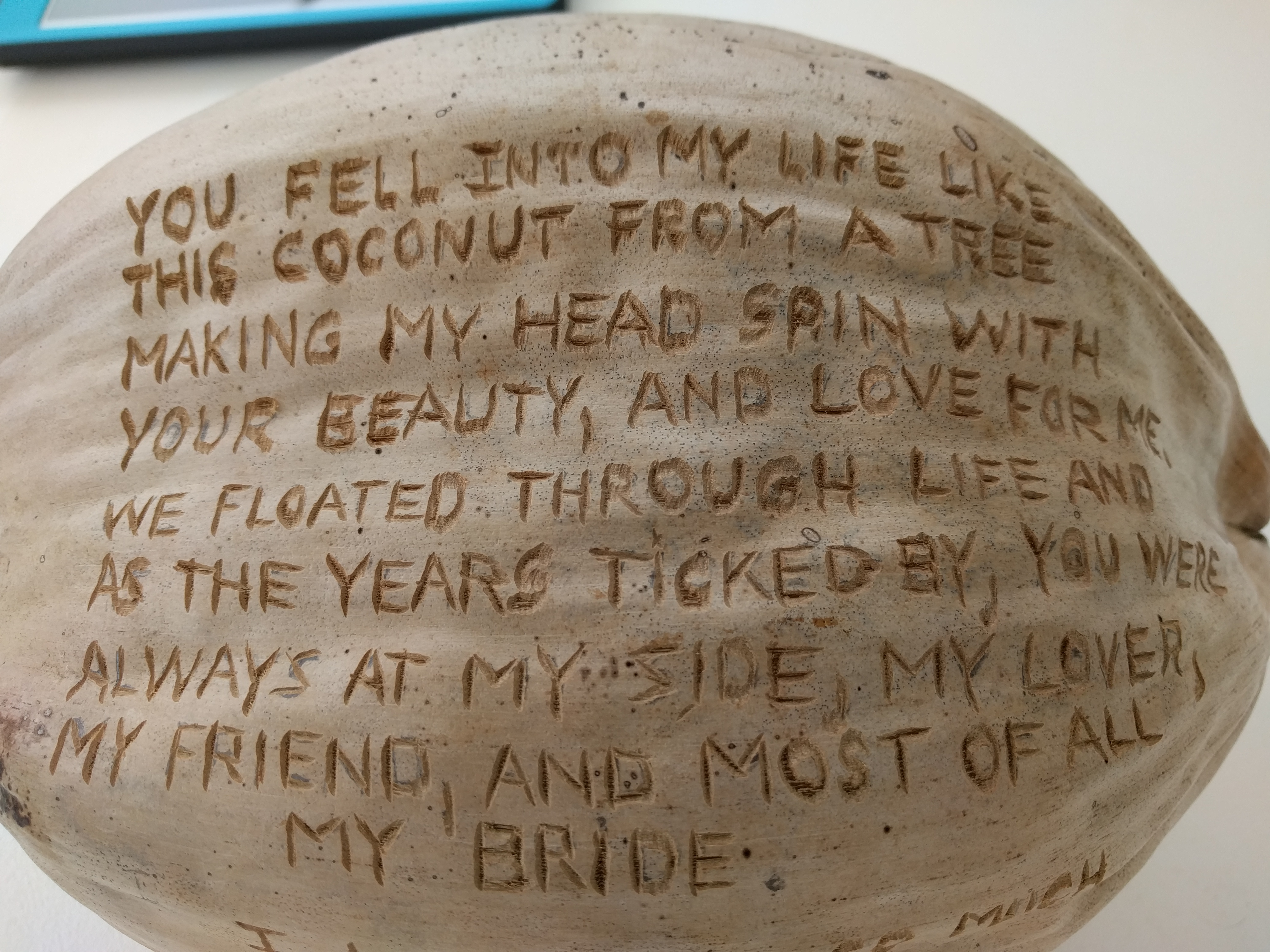 This coconut was in our “furnace” room when we bought the condo. Gary thought up the verse and then used a drumel to put the words on the coconut.