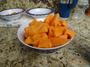 scooped out the seeds, which by the way looked super nasty.  Almost like alien pods or something….euw!  Then I cut off the skin and cut up the fruit