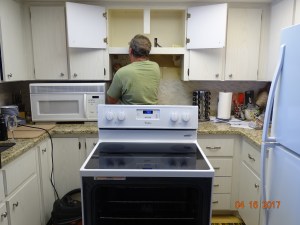 the stove needs some work. The other people just took out the range hood and put a microwave in there. It must have been a while ago…..no turn table….only 750 watt, but it still works. At least we don’t have buttons and dials like the people above us ;). And yes, the cupboard above the microwave is a dandy place to store liquor, which makes this a favorite cupboard :). But there is not much space between the stove cook top and the bottom of the microwave. Ya know, I’m short, and I still have to bend over to read the dials and readouts for the oven. Soooooooo, along comes handy Gary!