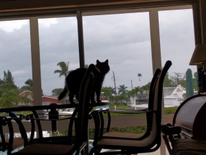 We brought in our patio furniture and put it in our living room. The cat thought that was great fun. Now he had a really high perch to sit on and watch the “Florida mice”.