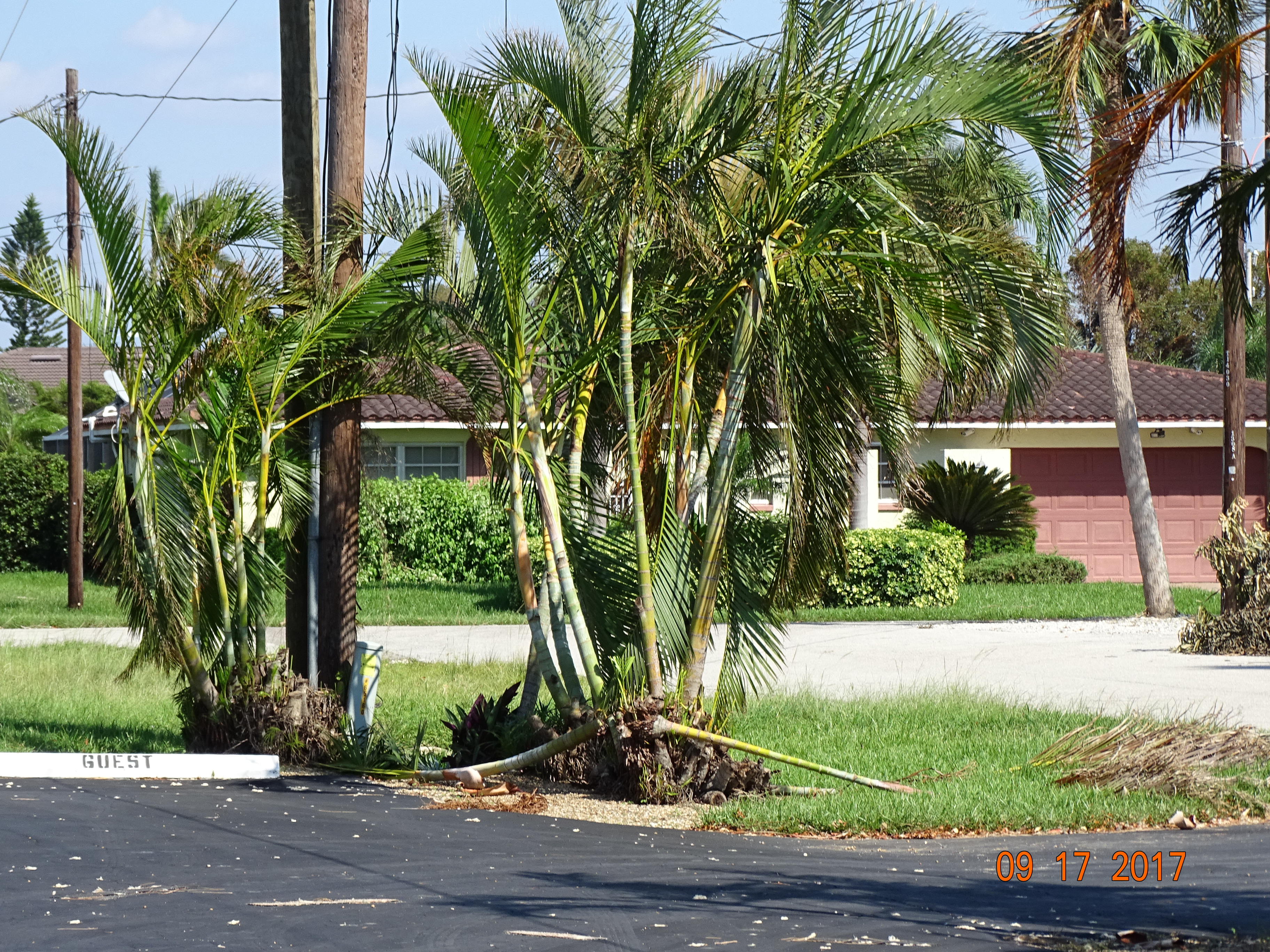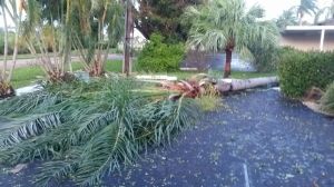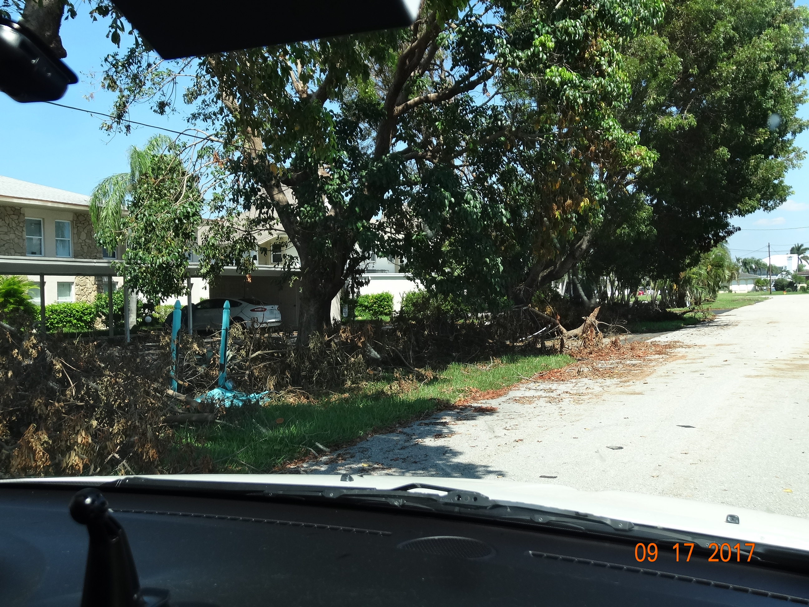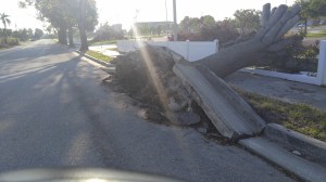 We hadn’t seen too much hurricane damage. We saw more standing water in places but not as much wind damage as I’d expected. As we made our final turn down Del Prado, still, not much damage, A few blue tarps, a few trees down but again, nothing like we expected. As we turned down our street we saw more large trees down, sidewalks pulled up from the roots of the fallen trees.