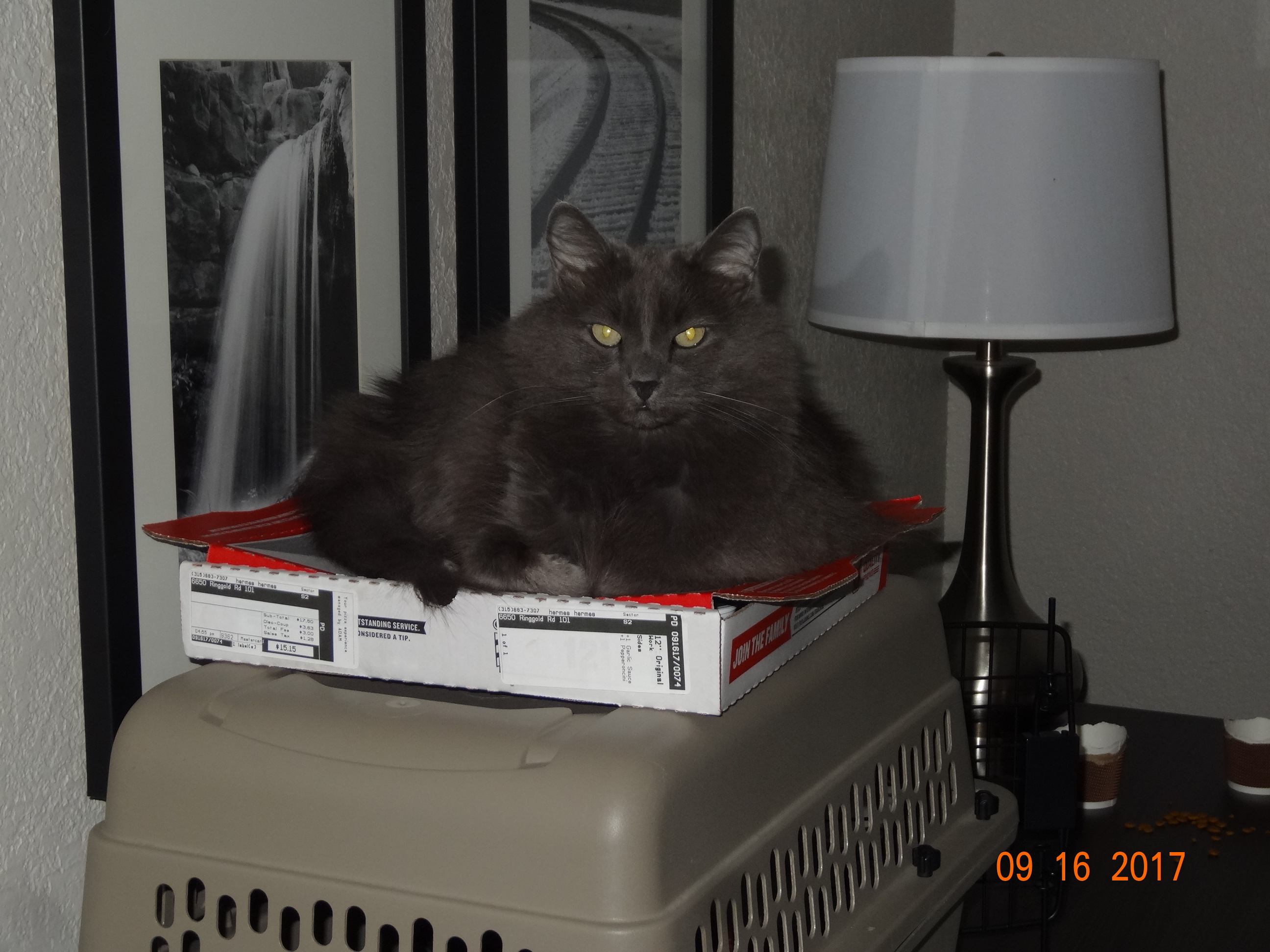 I think the stress of so much traveling has left him a little edgy. Luckily I shook his treat bag and got him off the pizza box so Gary and I could have some dinner. That cat will do anything for a treat ;).
