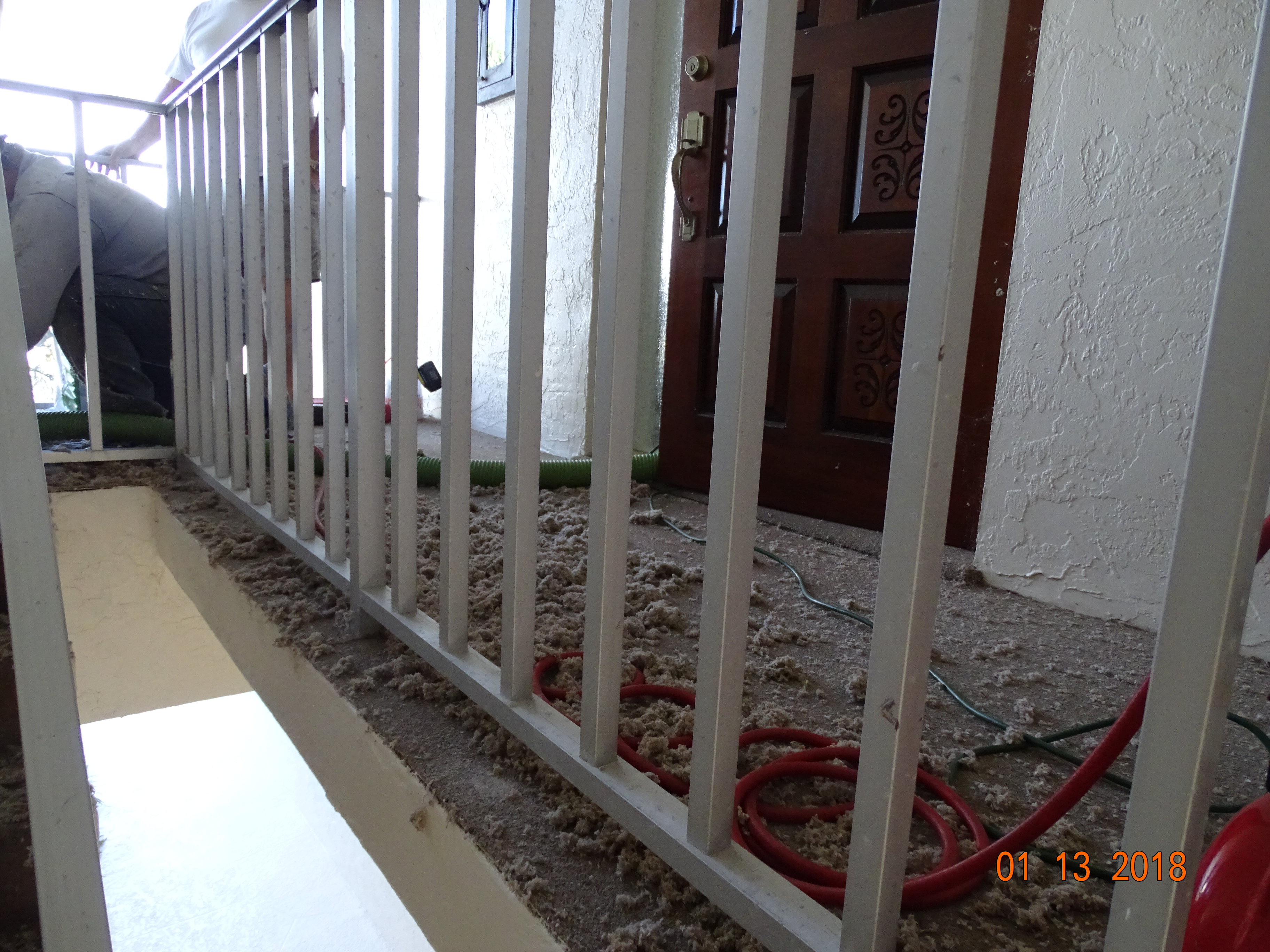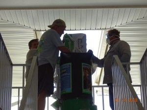 They decide they need to open the bag and “scratch” very small pieces off the paper block so the machine doesn’t clog. This works fairly well till they have another clog. They figure out there is a hose under the machine that gets clogged really easily. They have to tip the machine upside down, bang the machine, take the bottom plate off, unscrew the small hose, break out their air compressor, blow out the hose, screw the small hose back and start all over again. This happens about every 1/2 hour. Sometimes they get the machine to unplug by taking off the hose and turning on the machine so all the insulation blows all over the stairs