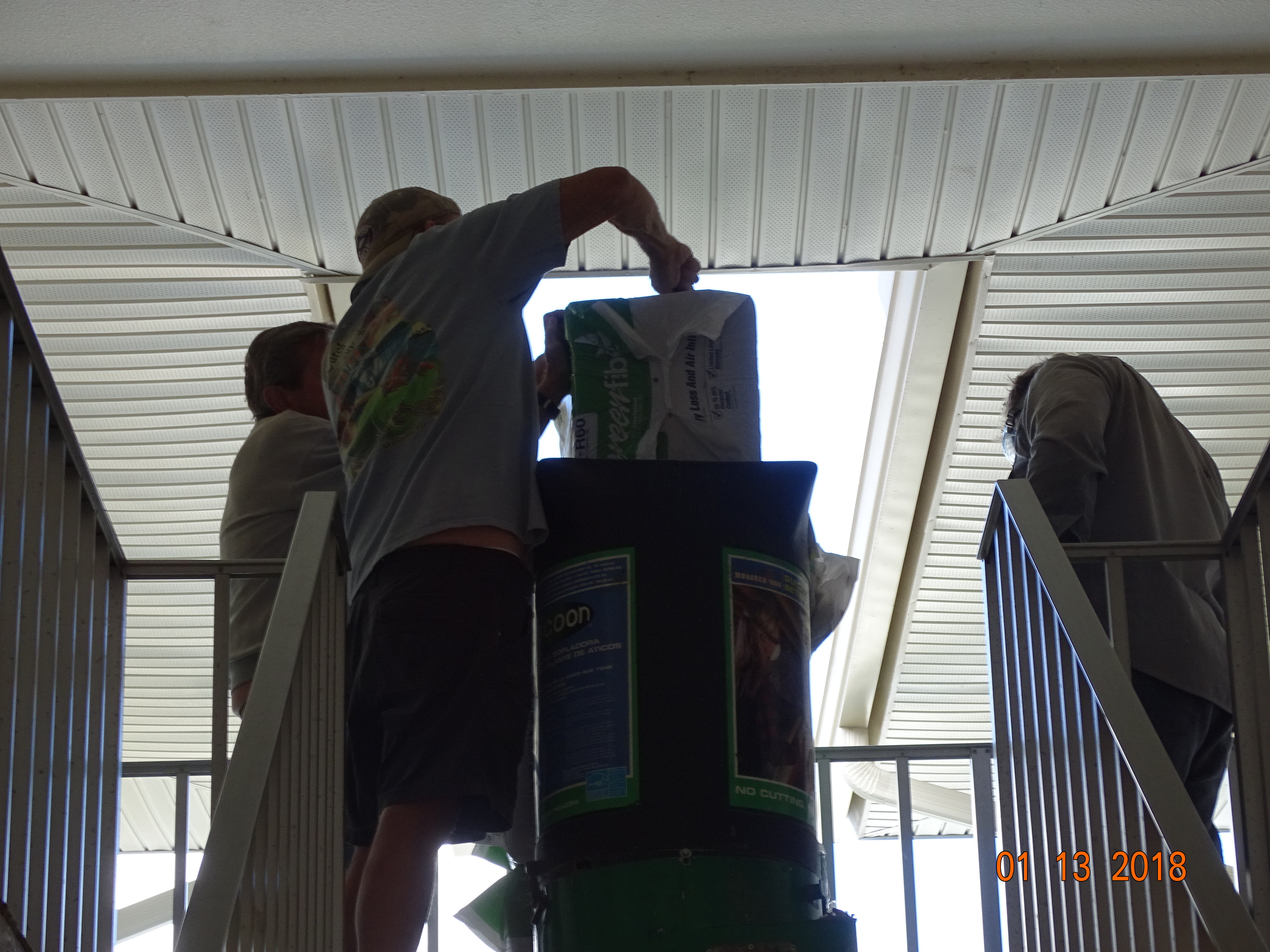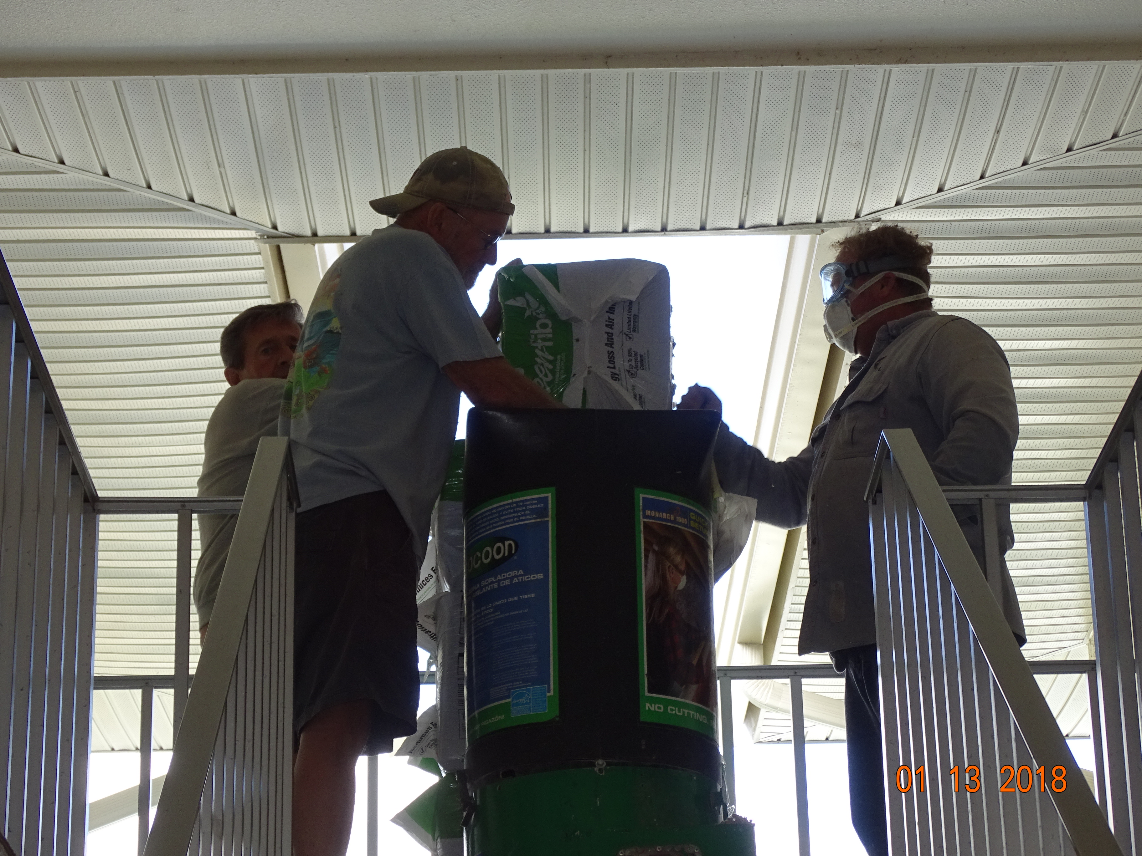 We have an annual meeting for the condo association….annually of course. And we just had it in January, we had a discussion about the insulation that blew out in the hurricane and the cost to blow in new insulation. One of the unit owner was complaining about his high energy bills, so a decision was made to put more insulation in the attic of both buildings. I had already received a bid of $1,000 for just one unit. “What!?” one unit owner exclaimed. “I can do all four for less than $500 and it will only take a few hours!” Most of the other unit owners agreed that was a wonderful idea and some even volunteered to help with the process, including Gary and I.
