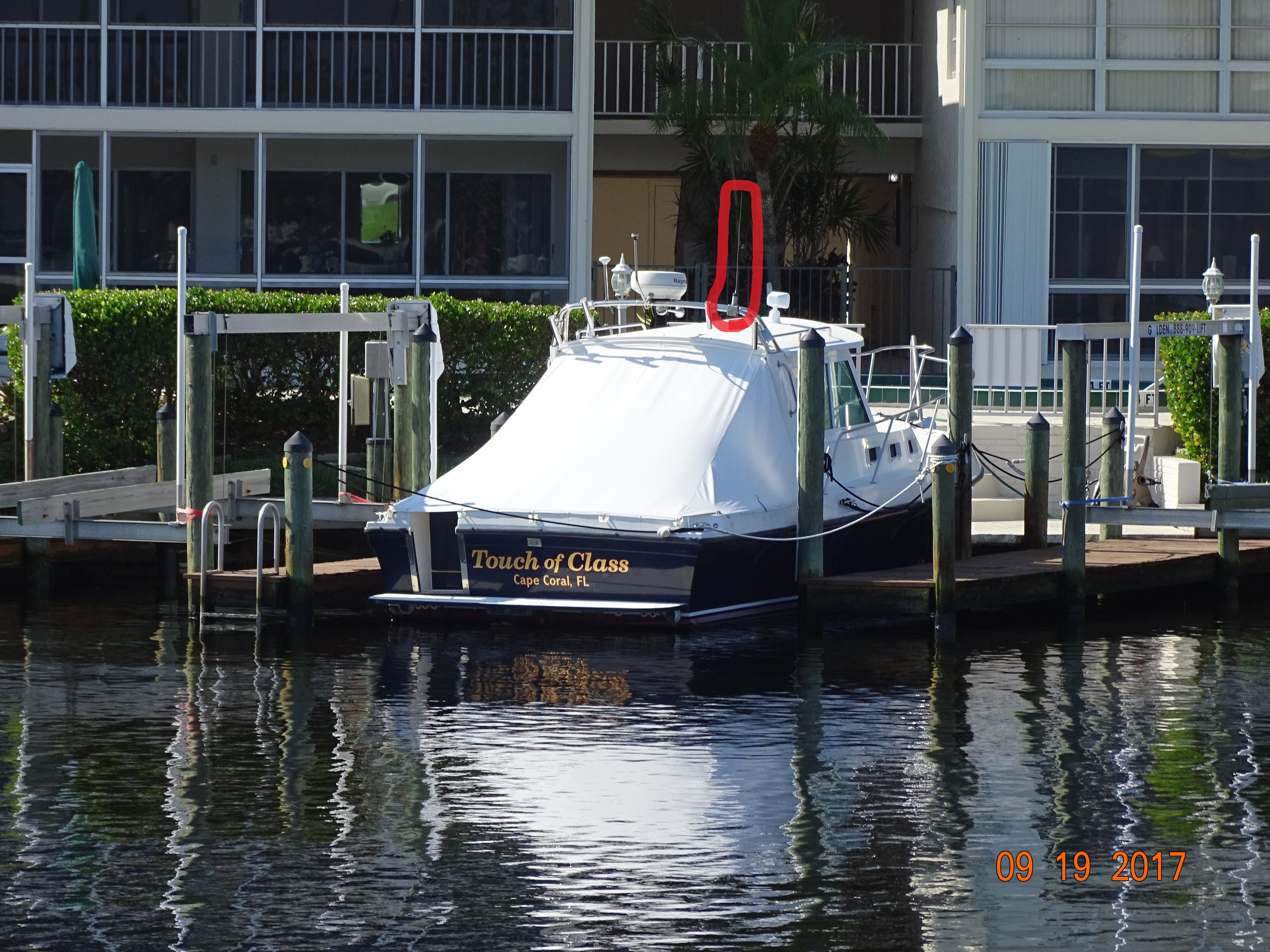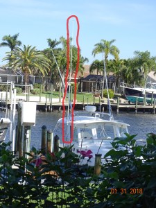 See those two aerials slanting back? Those are for fishing….see that real tall one? The one I circled? Now that is a MANLY aerial. We start off with a 8 foot extension and then add a 8 foot regular aerial for a total of 16 feet! Wowzer! That will make any man jealous. We decided to try it out on our way to South Seas. At first, all we could hear were people taking in Spanish. Great arerial, I told Gary, we’re picking up Cuba! Gary was impressed and happy with his installation.