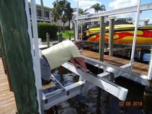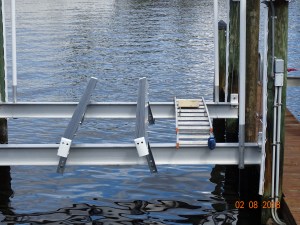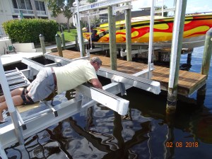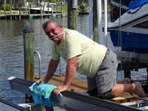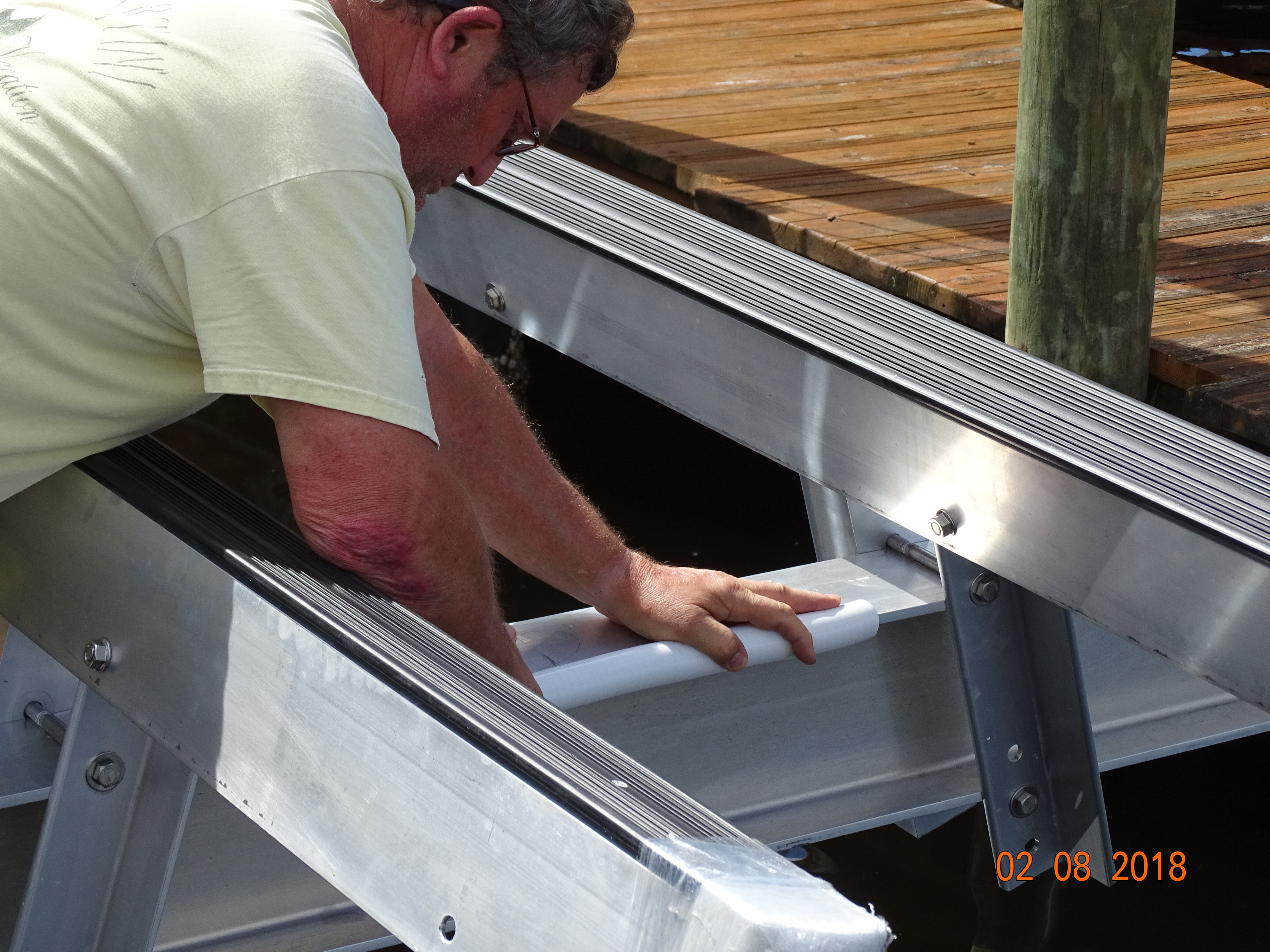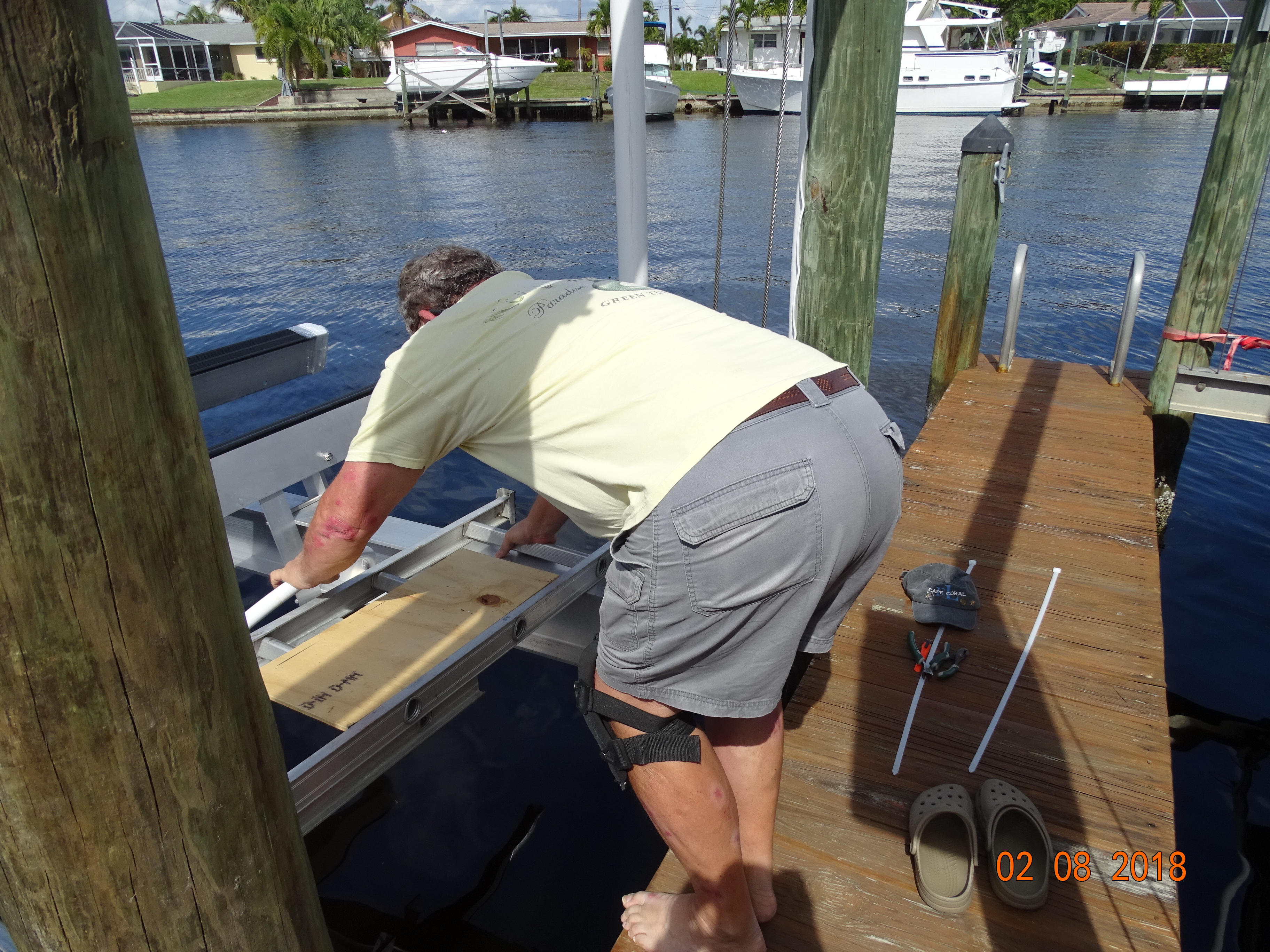 So once the boys were done with the installation of the lift and before the other guy comes to help us get the boat fitted for the lift, Gary decided it was a good time to soften up the back I-beam so in case the boat hit it, it wouldn’t chip any paint off or wreck the fiberglass.  So he went to the place where the lift was being sold out of and told him of his dilemma.  They offered a solution of a rounded dock bumper, but you had to buy 6 feet of it at a cost of $60.  So off he went to his favorite place for projects….Ace Hardware.  There he found a plastic hose about 2 feet long, cost…..$1.09 plus tax.  Good Trade!