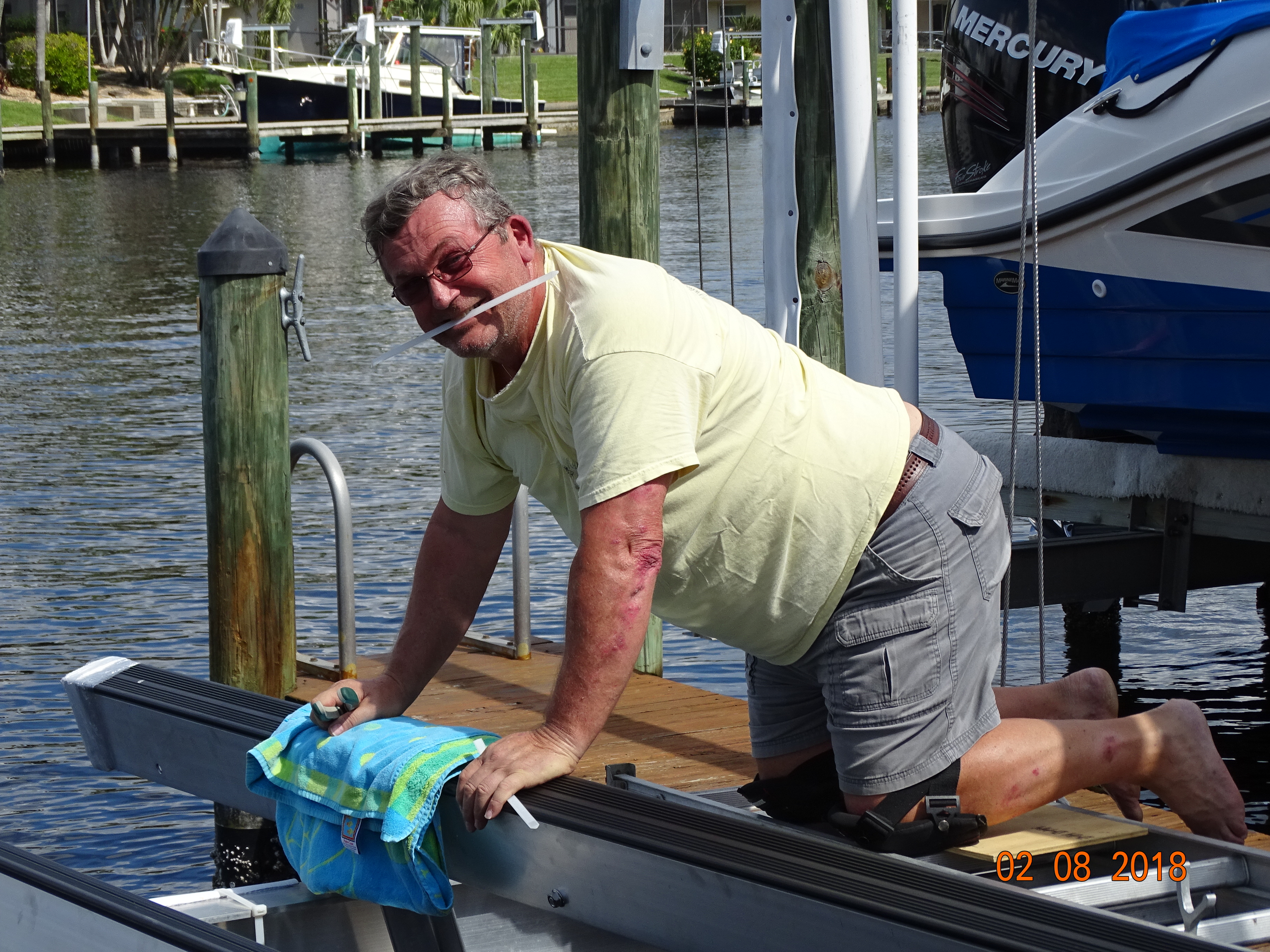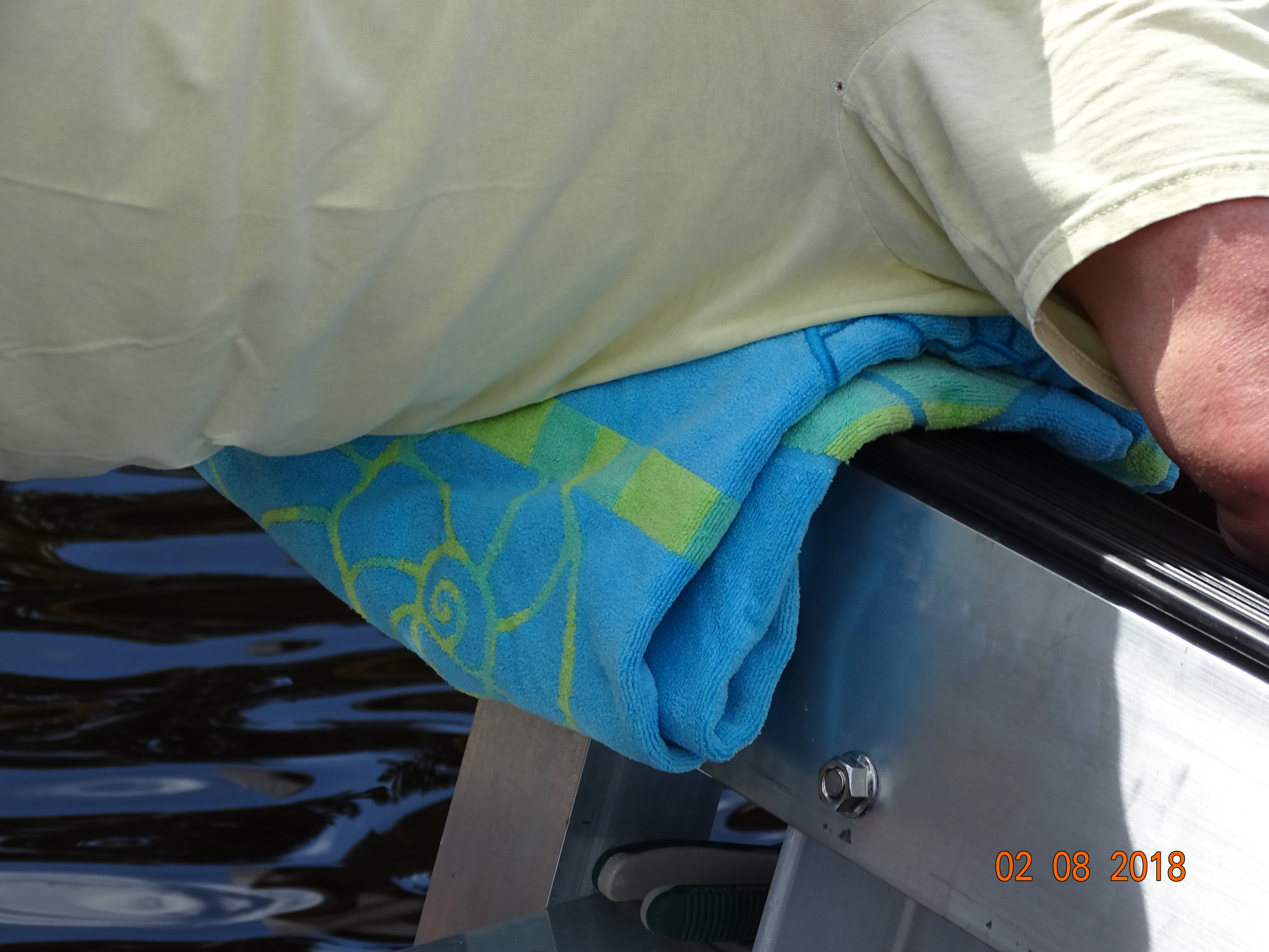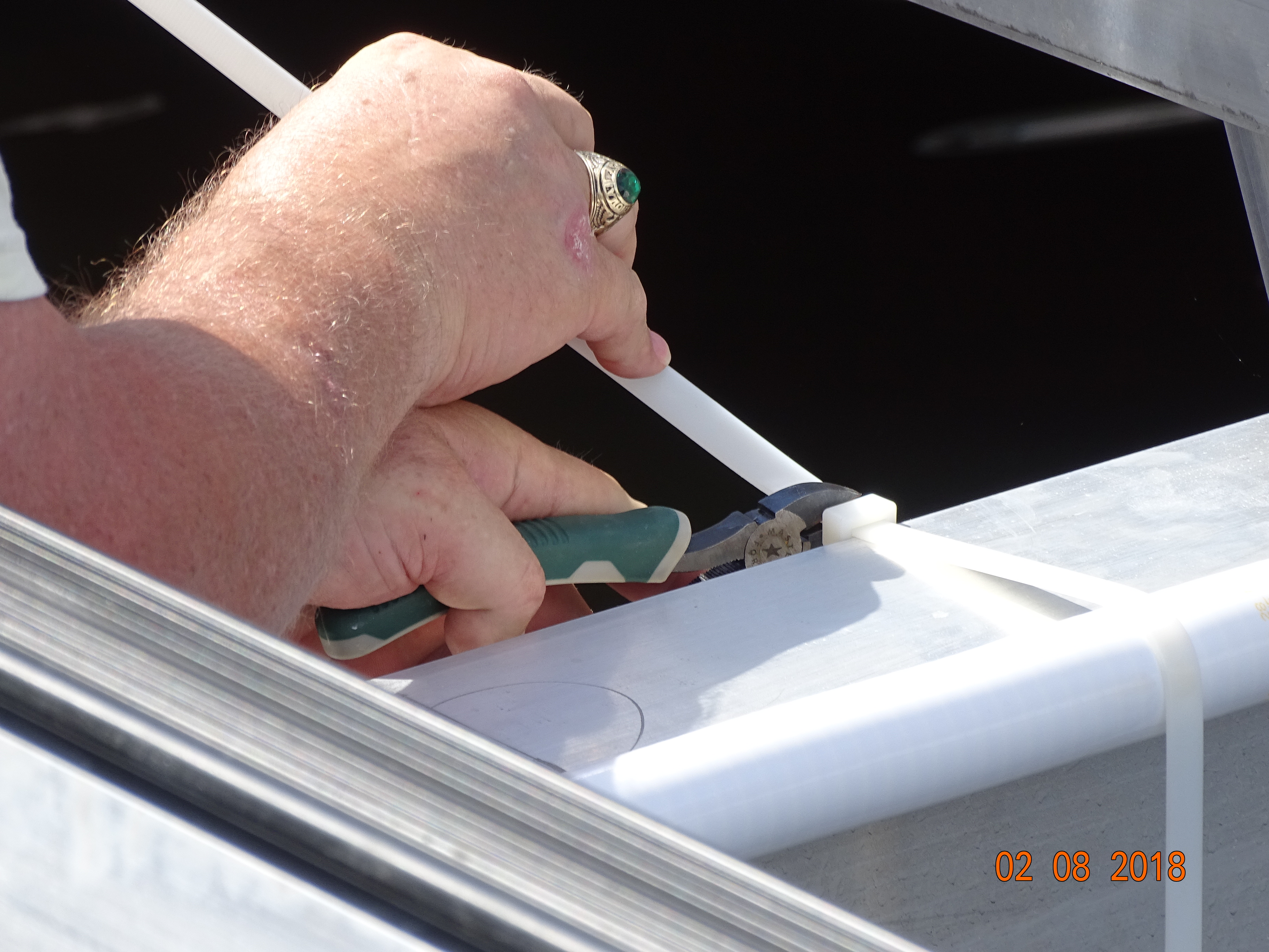 As further protection we’ll add our knee pads, take everything out of our pockets and leave our hat on the dock.  Then we lay across the bunks  so we can reach the place we are putting the plastic hose on.  See how well it went on?