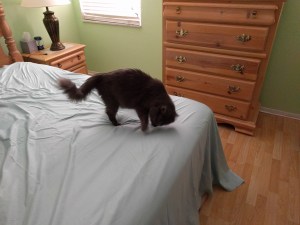 First we make the beds so they have nice clean sheets to sleep in. Smokie has to help smooth out the sheets