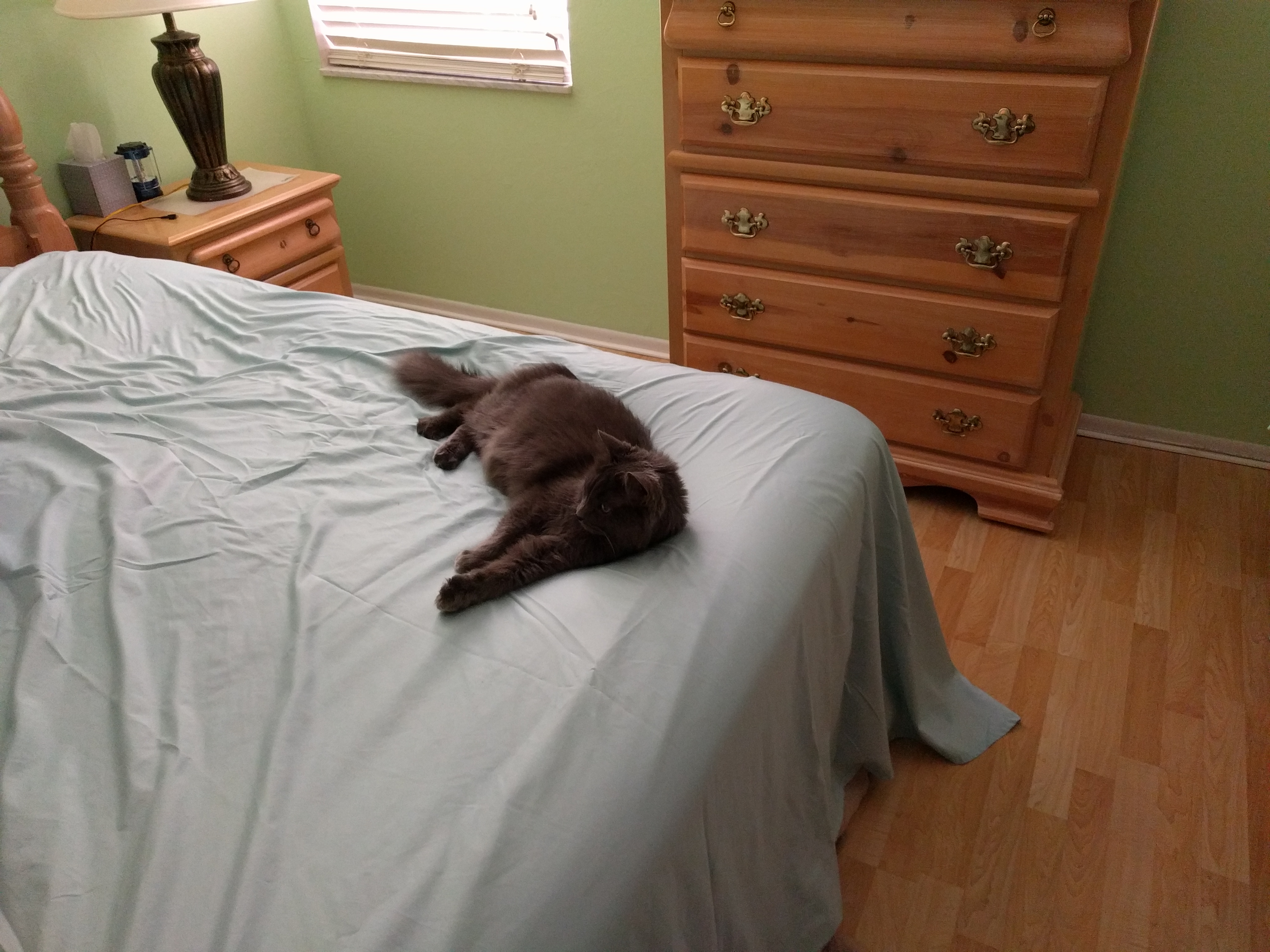 First we make the beds so they have nice clean sheets to sleep in. Smokie has to help smooth out the sheets