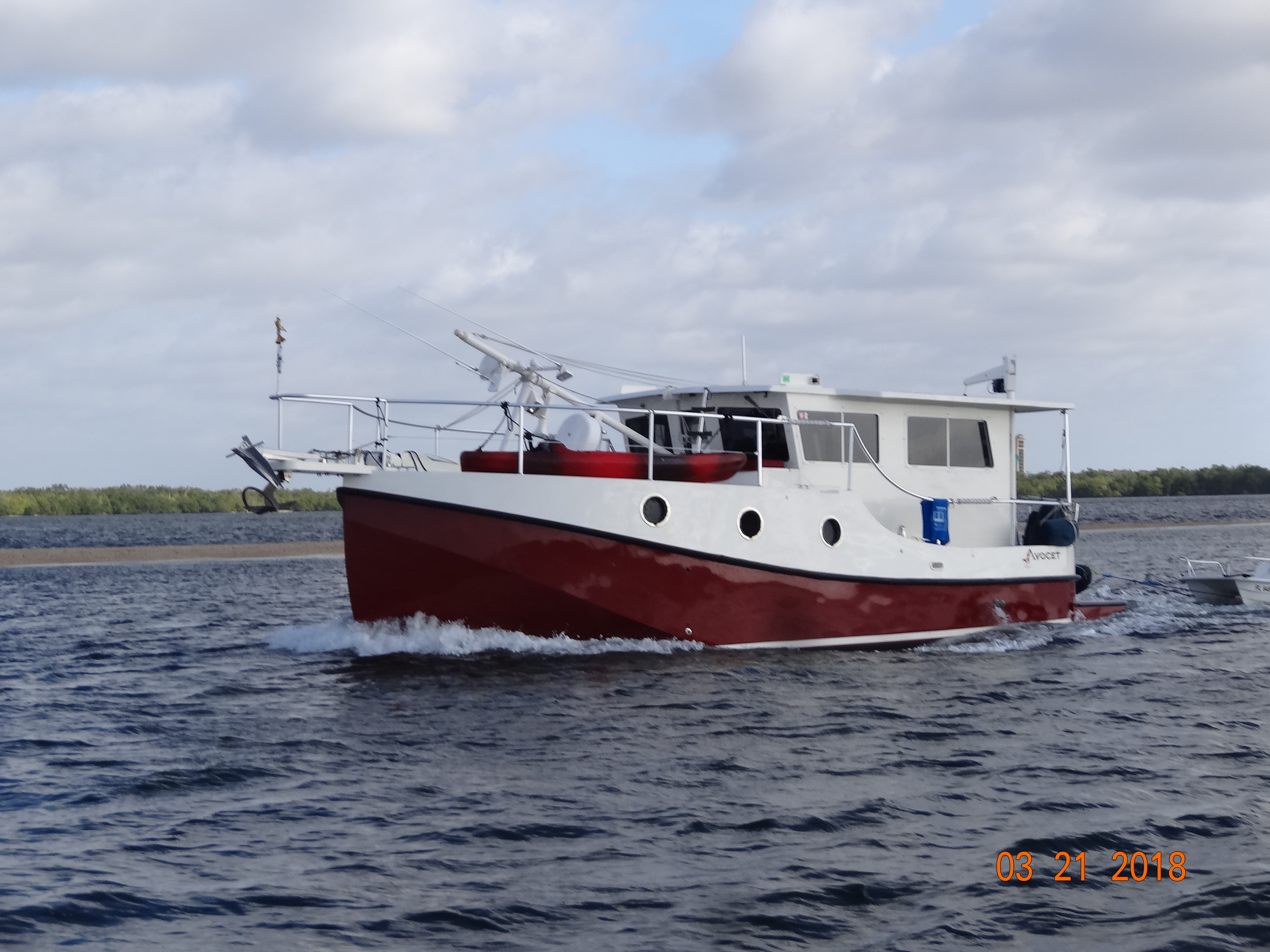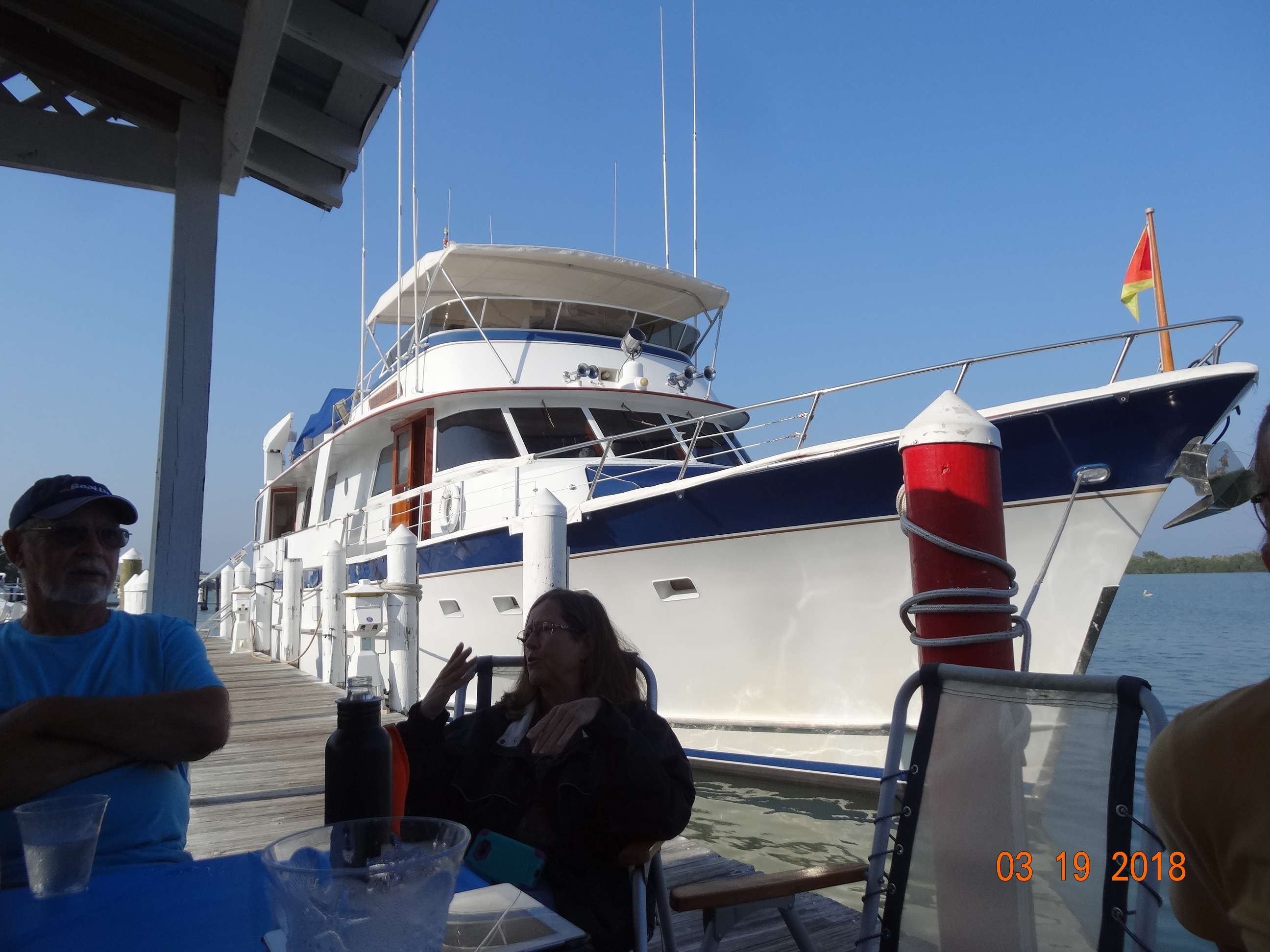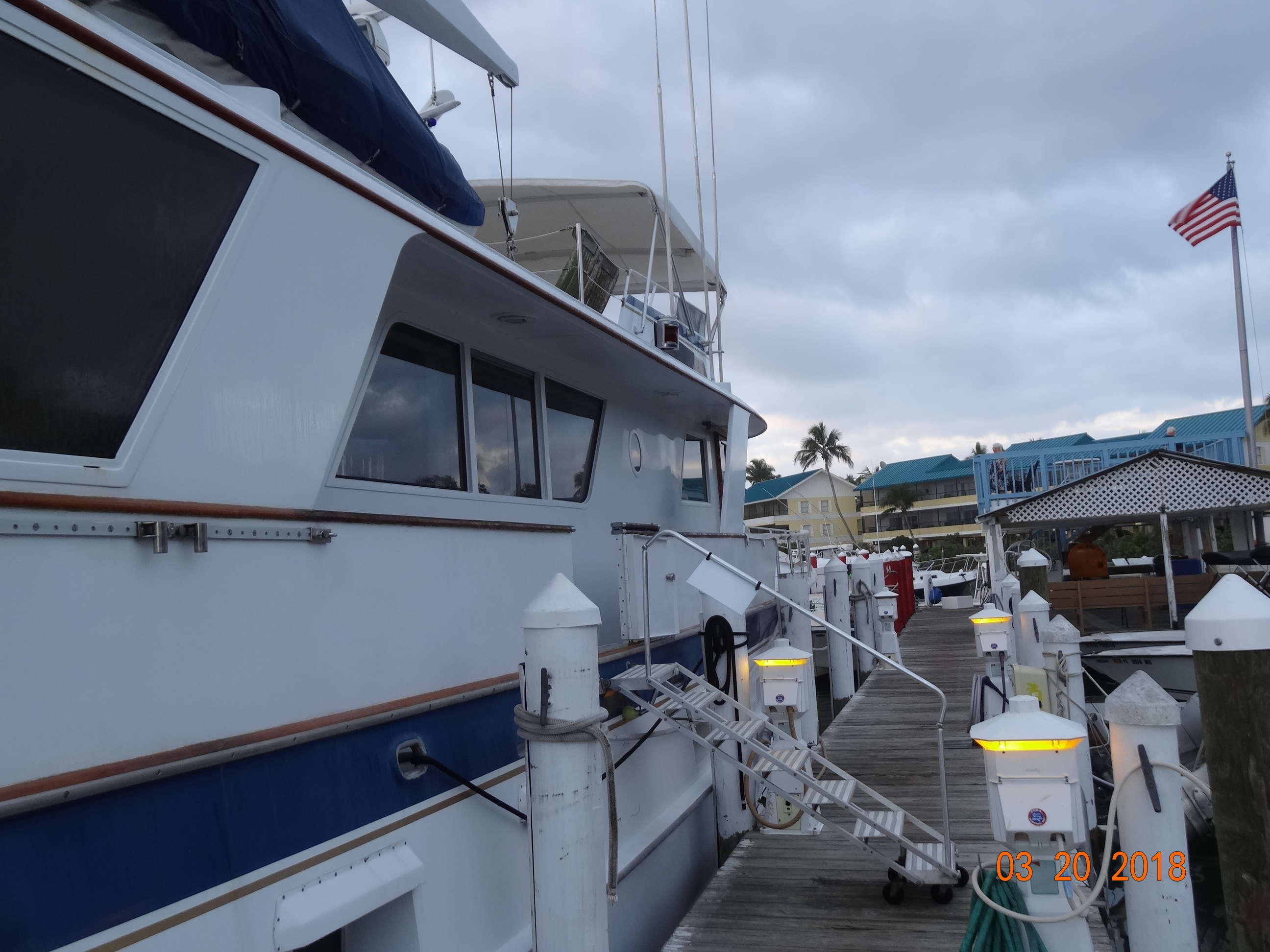 This is a 37 Great Harbor. We fell in love with this boat the first time we saw it at a boat show on the East coast many, many moons ago. Big heavy duty railings, full size fridge, nice boat. But now after traveling and living on boats, I find I prefer a boat that can get up and go if need be and most of these boats have small engines. Good on fuel economy but not so much in the speed department. Kind of a no go show boat ;).