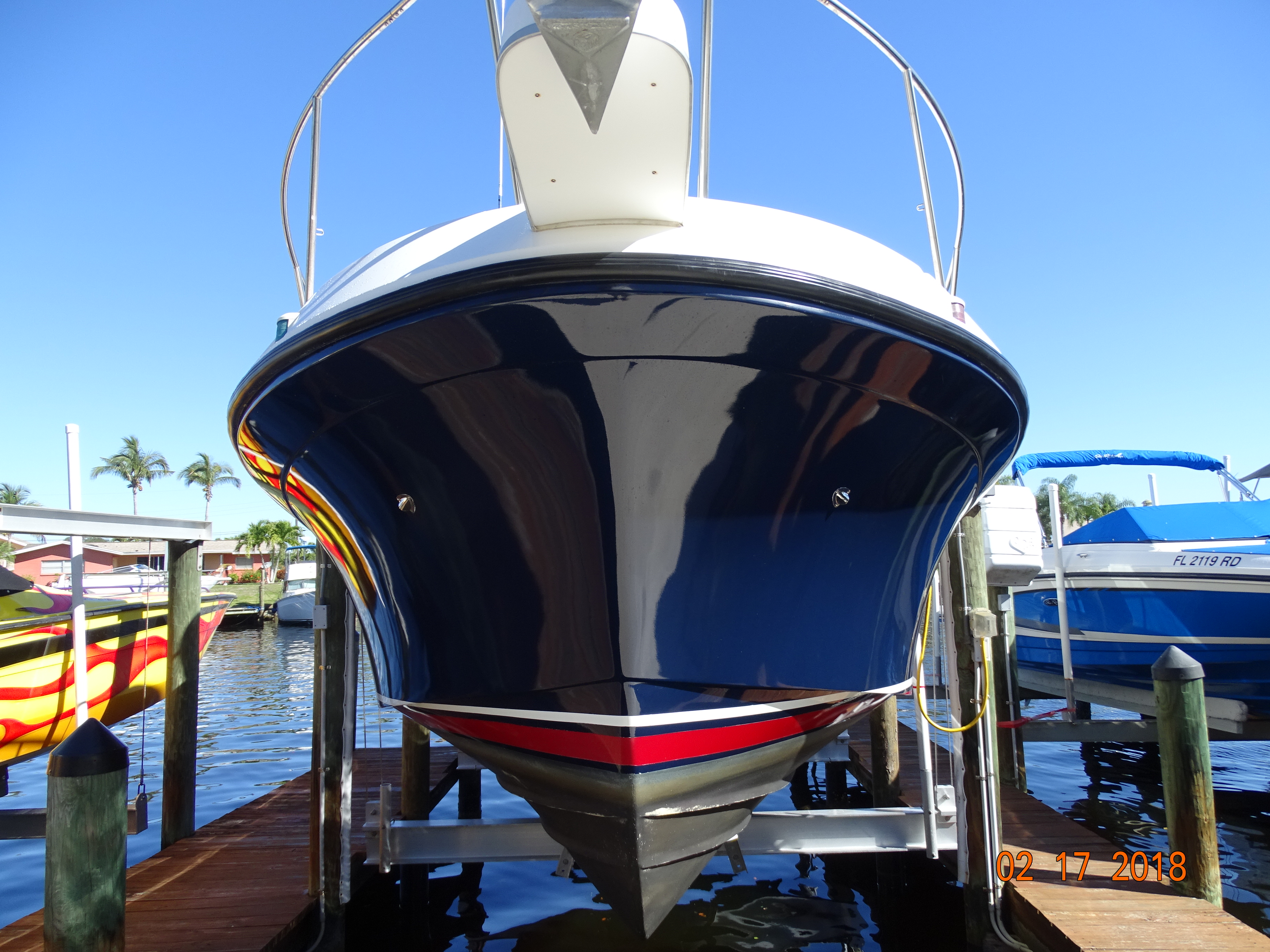 We attach straps from the lift to the dock (this keeps the boat from swaying in a strong wind) and then, last but not least, we attach some lines from the boat to the dock (this is just in case the tide gets super high during a hurricane and the boat floats off the lift, it won’t go far).  So here it is all done