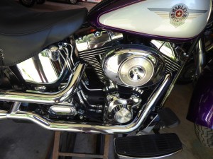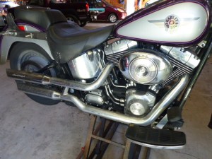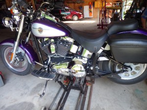 Before we left, Gary decided to ride our son’s Harley Davidson FatBoy up to BearTrax.  He’d get a little ride in and as payment for borrowing the bike, he said he would detail out the Harley.  Well the bike didn’t have a windshield on it and then it started to rain when we were almost there.  If you’ve ever ridden a bike without a windshield in the rain, I can tell you it is not much fun.