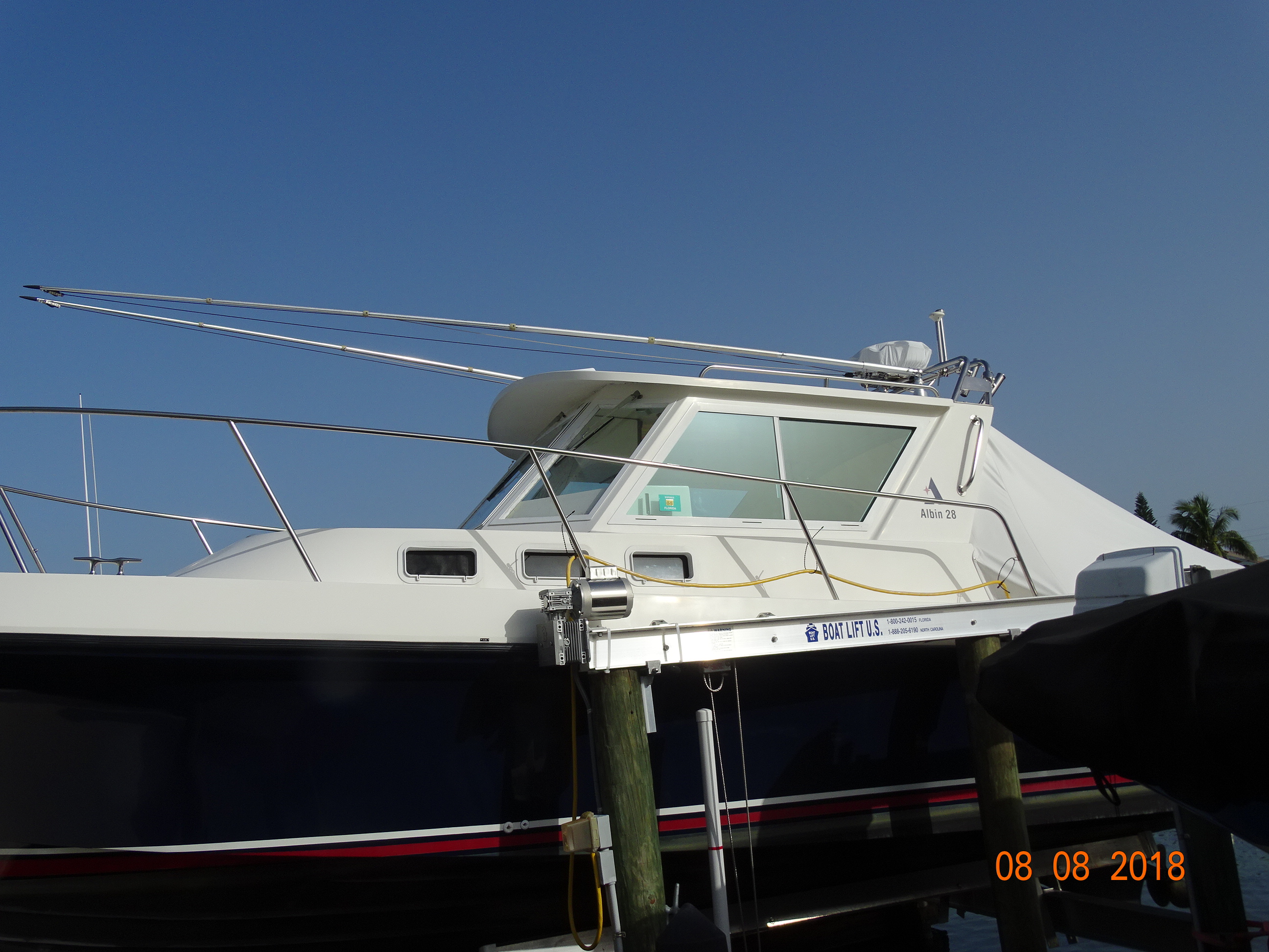 So the first thing we do, as I am I sure you all do with a boat or car that you are planning on storing for a while, is change the oil.  Then we also pump the head, put in more chemical, fill the boat with fuel and fuel additives.  We clean and roll up the bimini cover and put on the cockpit cover, vacuum out the bilge, plug-in a humidifier, bring in all cushions and electronics and we spray the cockpit cover with a solution of 50/50 water and vinegar (this keeps the canvas from molding).  Once this is all done we lower the antenna and outriggers (keeps the boat from being a lightning rod  ).