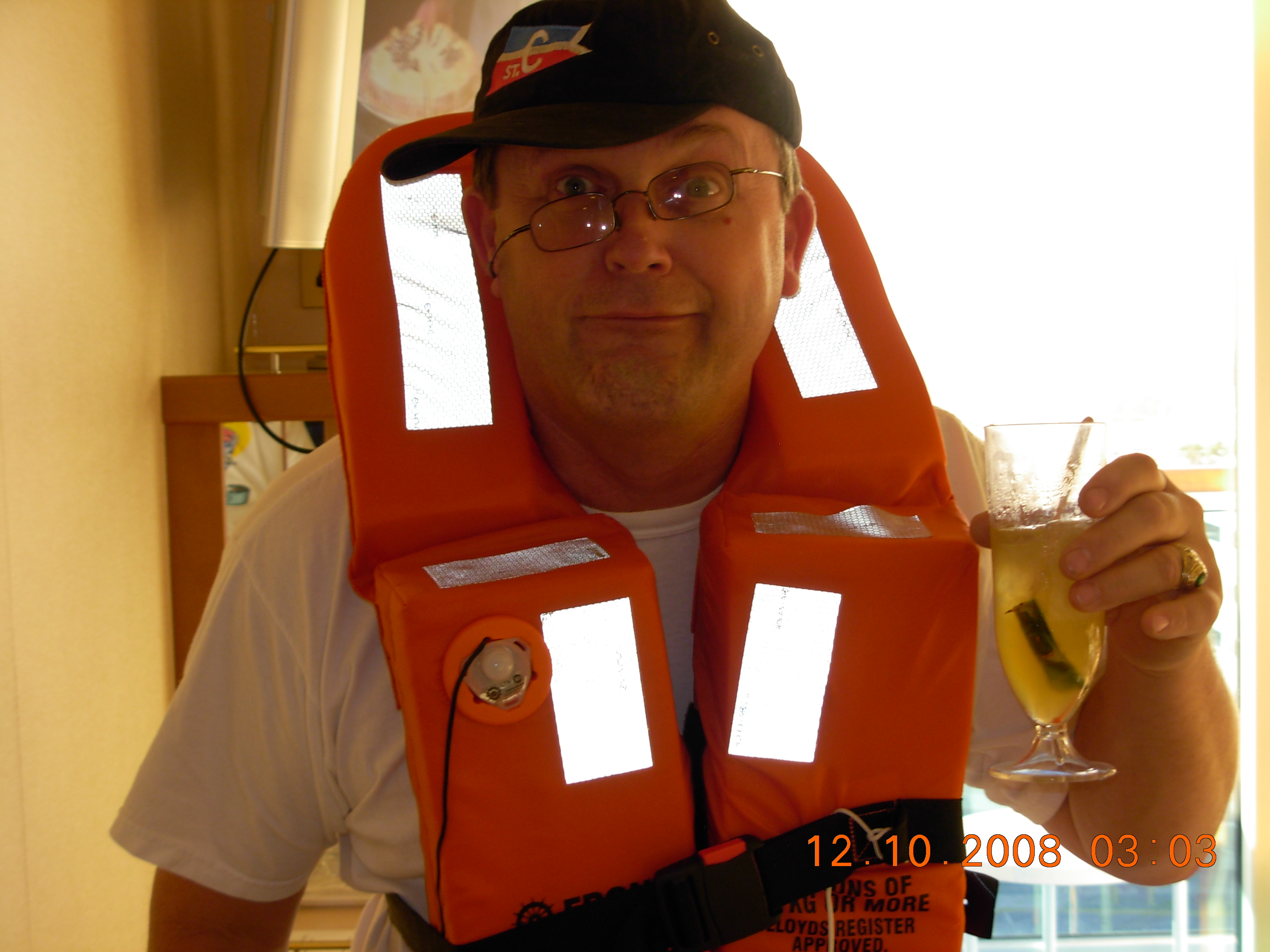 For those of you that have never been on a cruise, they have a thing called a muster drill. What this is, is each room is assigned to a certain part of the ship to go to in case of an emergency. We had muster station C. So they call this drill before they leave the port. Here is Gary getting ready to go to the station