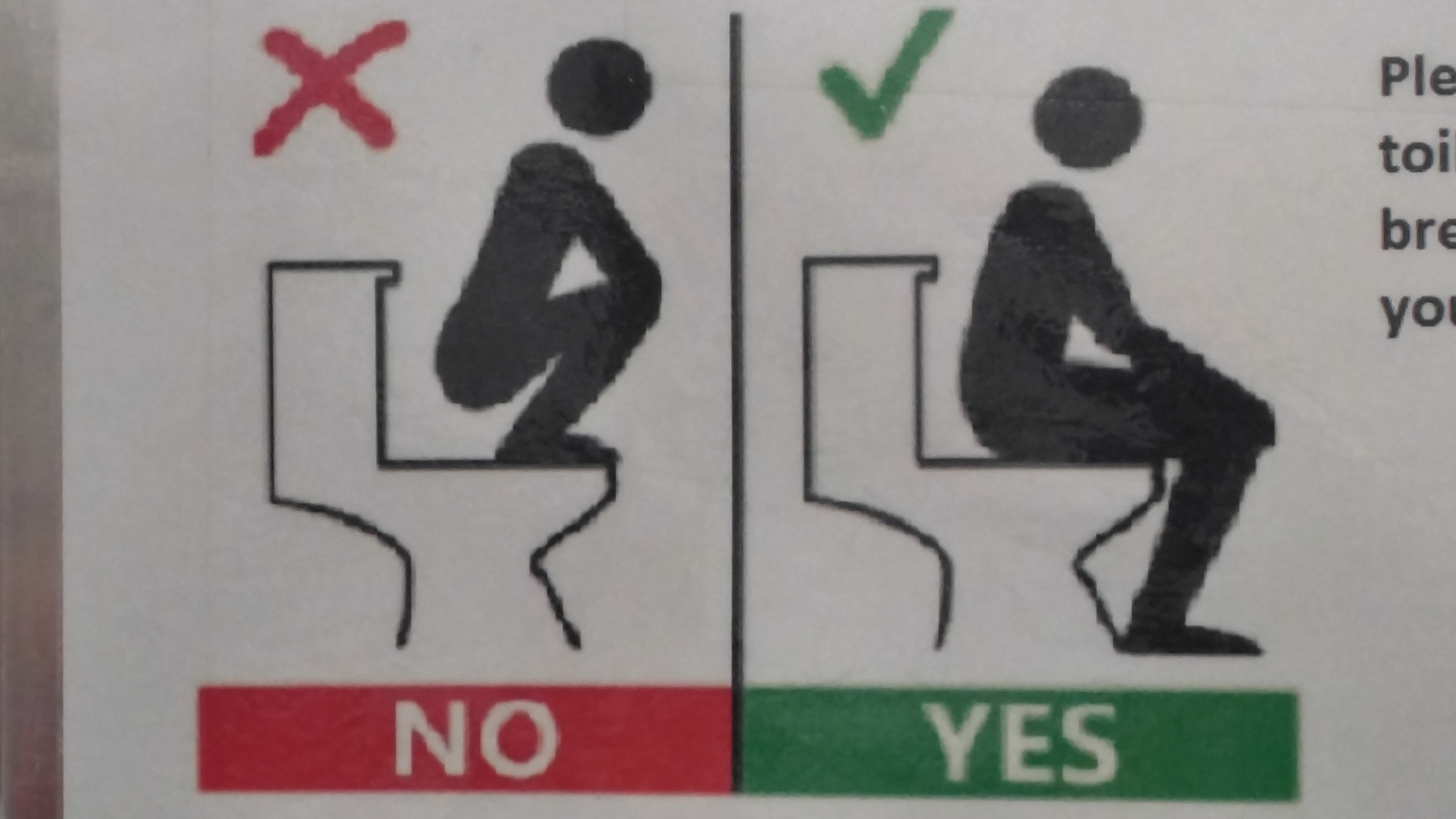 WHAT???!!!! I can’t even believe they had to put that up there to remind someone the correct way to sit on a toilet. Is the “no” for people who have a bidet? Is this “no” for people who are used to leaning up against their snowmobiles? Is this “no” for people who are used to leaning again trees? Come on ladies! This is the 21st century! You MUST know how to use a proper toilet by now? Well, anyway, I got a big chuckle out of that and I just had to take a picture. I’ve never seen that before, have you?
