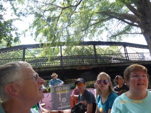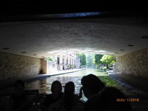 We finally found the River Walk and a place where we could get on one of the boats. We figured we take the boat tour first and then hit the place by feet later. The River Walk is 15 miles long and it flows through approximately 5 miles of downtown San Antonio. Our boat tour guide the one in the blue shirt and straw hat at the back of the boat, was very talkative.