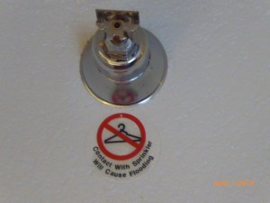“Contact with sprinkler will cause flooding”  Haha!  Holy hoot!  Who hangs up their clothes on a fire sprinkler?  Geez people, where is your common sense?  I’m always amazed at how stupid people can be.