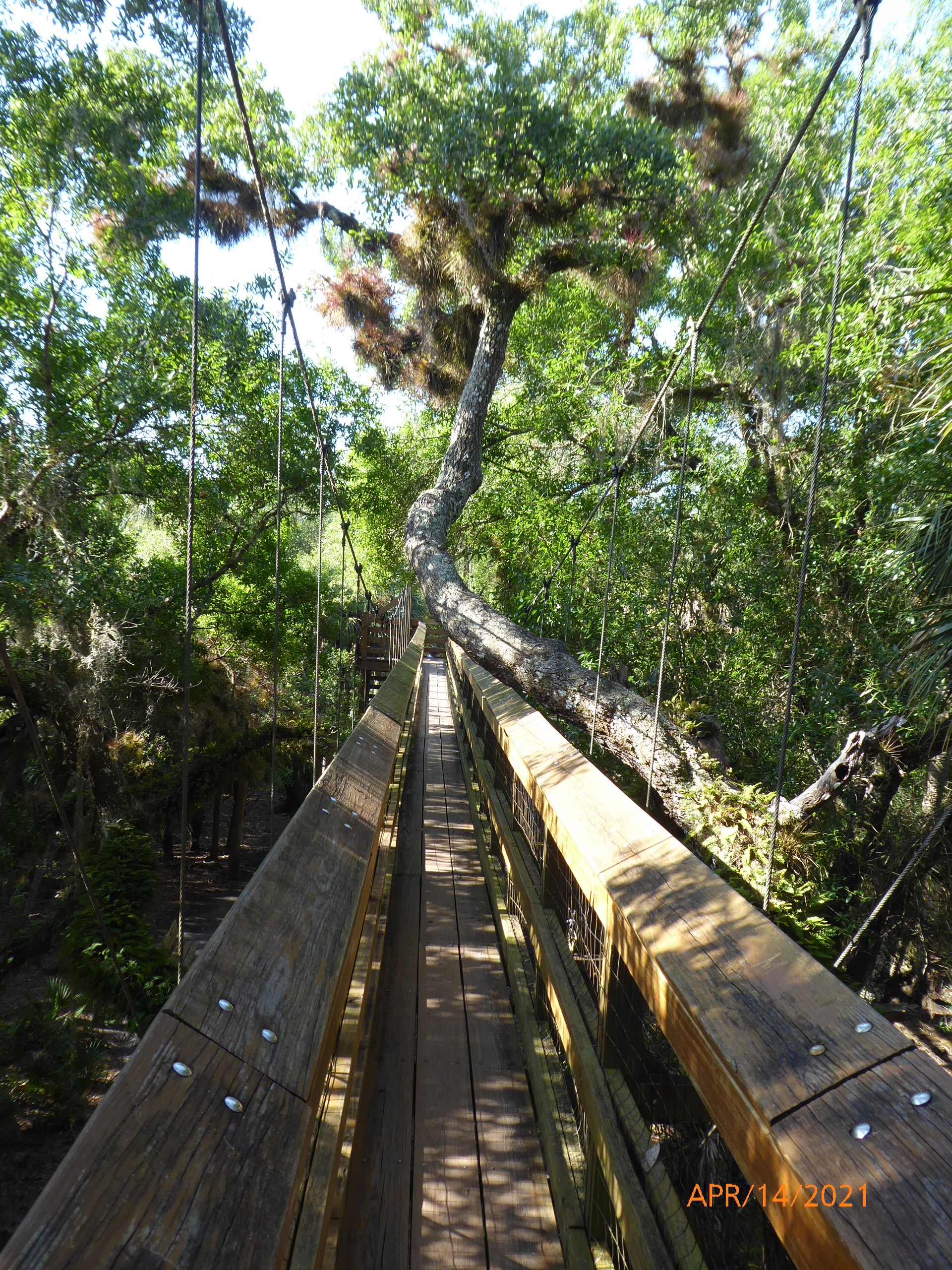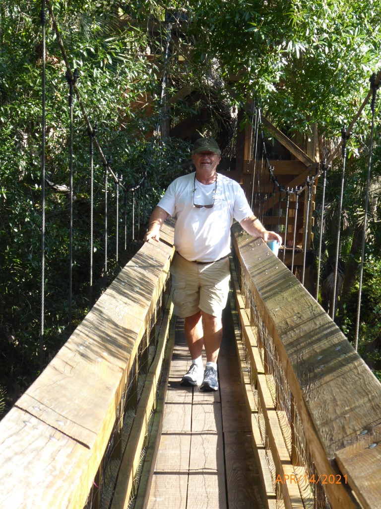 This bridge was suspended between two “towers”. One was about 35 feet high and the other was about 70 feet high. You walked from the 35 foot tower to the 70 foot tower. After we walked over the bridge, they had put up a sheet of plywood so you couldn’t get up the stairs on the 70 foot tower. We tried to figure out what that was all about, we figured maybe something happened and they needed repairs. Later that day we saw a Park Ranger and asked him. He said the week befor it was still Spring Break and the place was very busy. All these 20 something kids going thru the park, climbing to the top of the tower and it was packed! A Supervisor of some kind happened to be visiting the park that day, saw all the kids in the upper section of that 70 foot tower and had them shut it down. Ya just never know what all those kids could do.