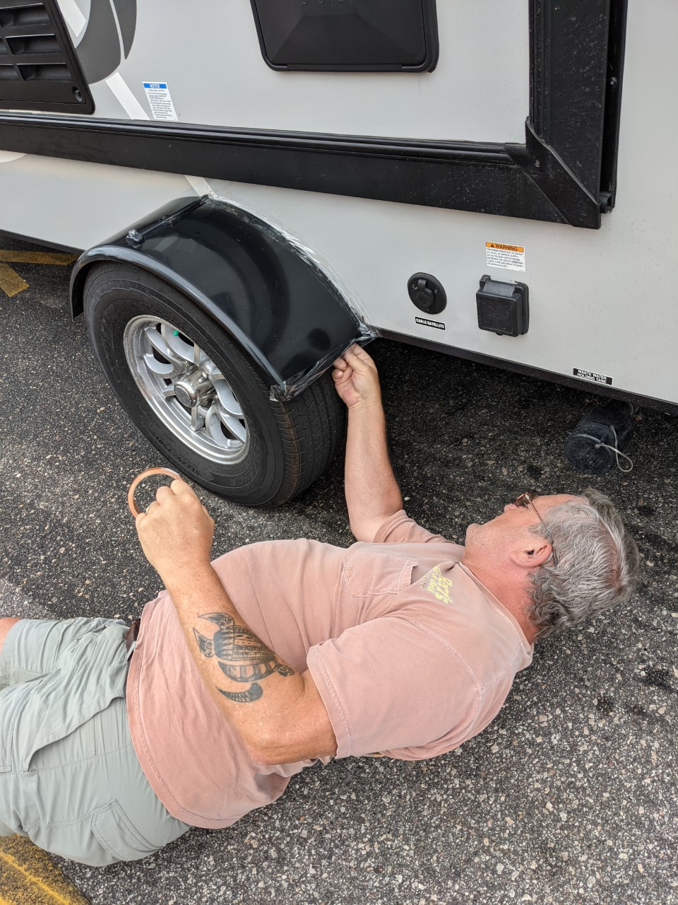Before I get into this part of our story, a little history about the RV might be good. We bought the RV from the 2nd owner. One of the previous owners took off the factory tires and put taller tires on “so it could go off-roading”, like who “off-roads” pulling a trailer? Because they put on taller tires, the space between the tire and the fender is considerably smaller than it should be Now that you have the history, back to the story…..