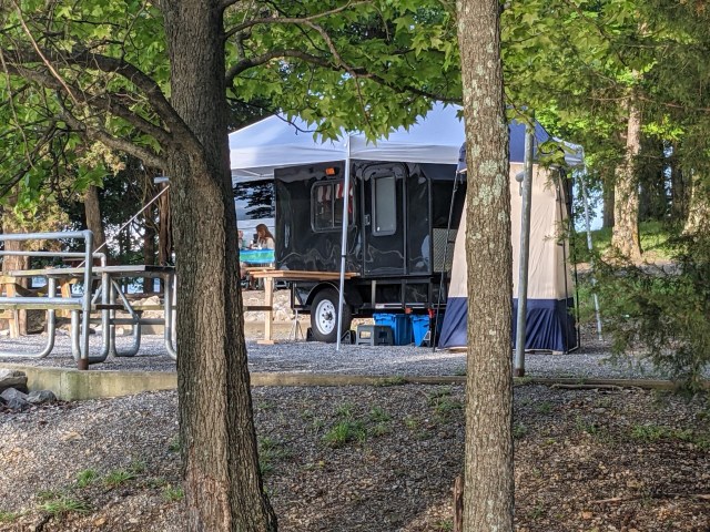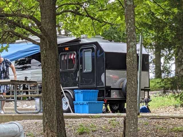 So, when they were all done, they had a little table hanging off the camper, a small step stool, multiple containers on the ground and I don’t know what that little tent is for. Is it a changing room or a place to do your business? Oh well, good for them. If I had to go to that much effort, I think I’d stay home. And then guess what? They left around 4 to go out to dinner, and didn’t get back till dark, then by the time we got up at 6:30, they were all packed up and gone. Jeez, all that work for one night. No way.